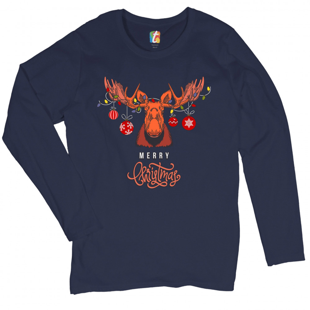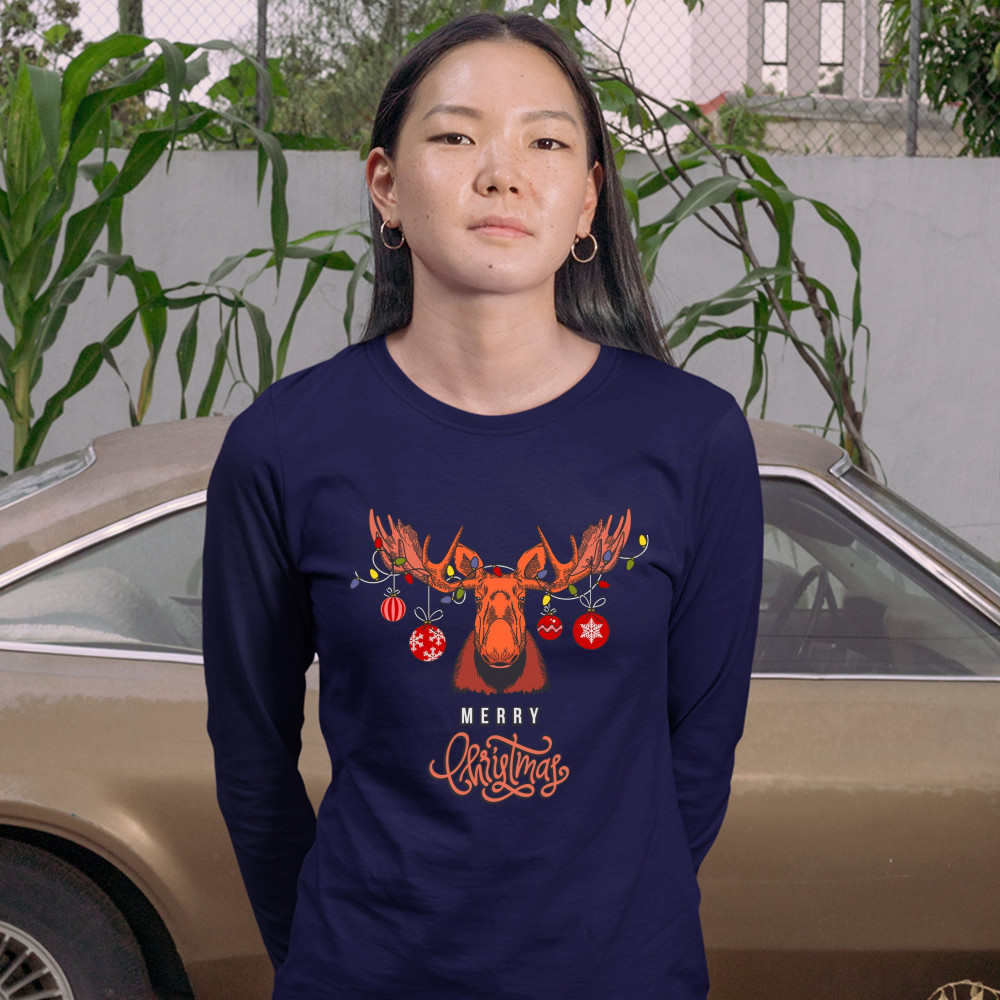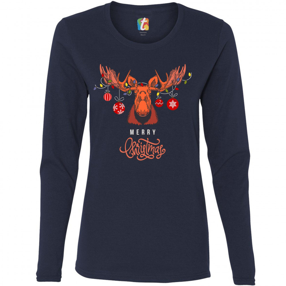 MERRY CHRISTMAS BUCK women's long sleeve t-shirt reindeer rudolph holiday navy blue