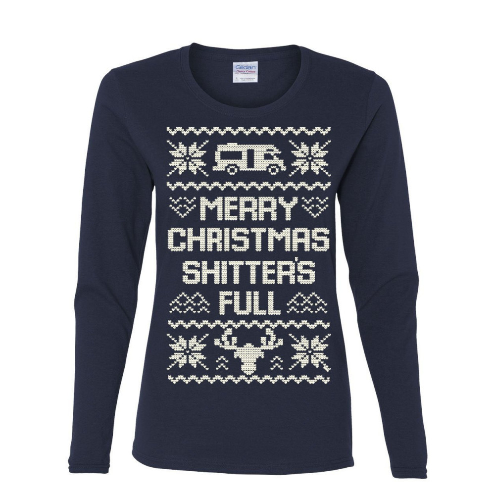 MERRY CHRISTMAS SHITTER'S FULL women's long sleeve t-shirt ugly sweatshirt xmas navy blue