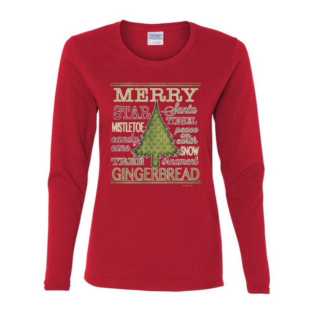 MERRY CHRISTMAS xmas tree women's long sleeve tee holiday spirit joy santa snow red