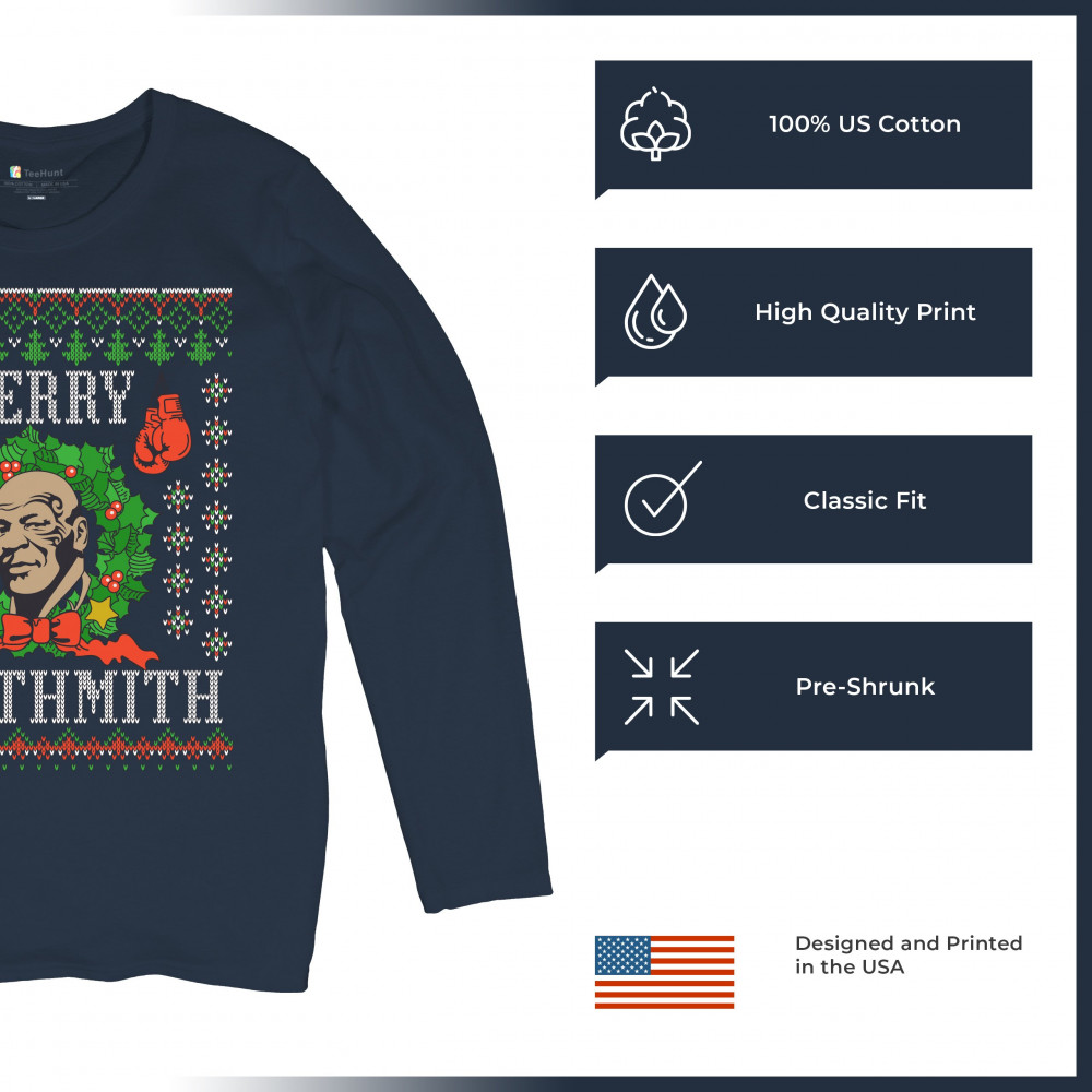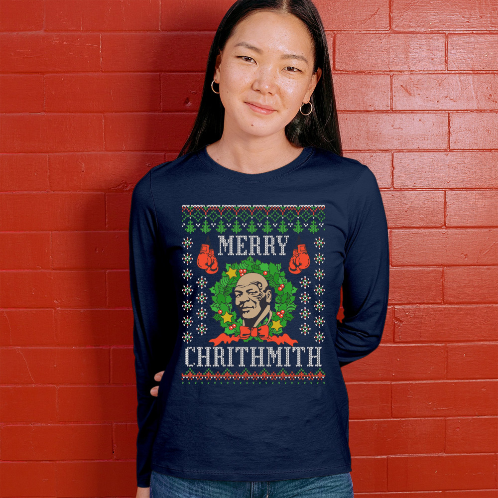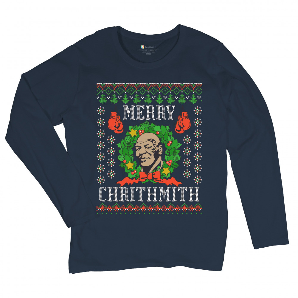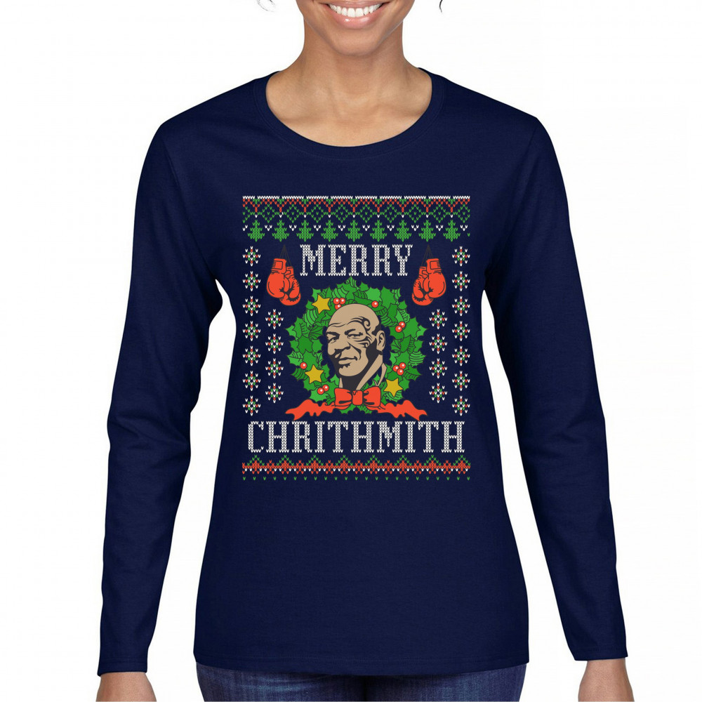 MERRY CHRITHMITH women's long sleeve t-shirt mike tyson ugly sweater christmas navy blue