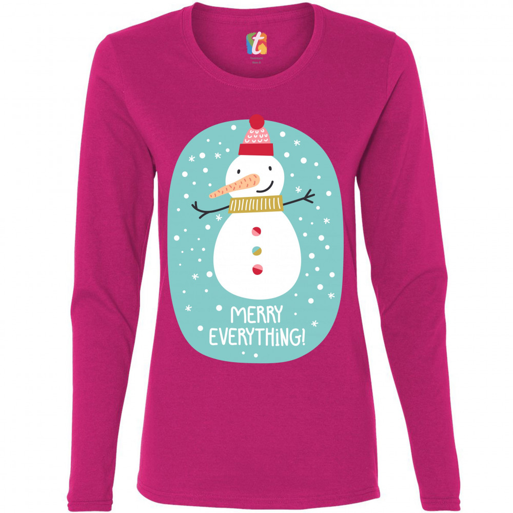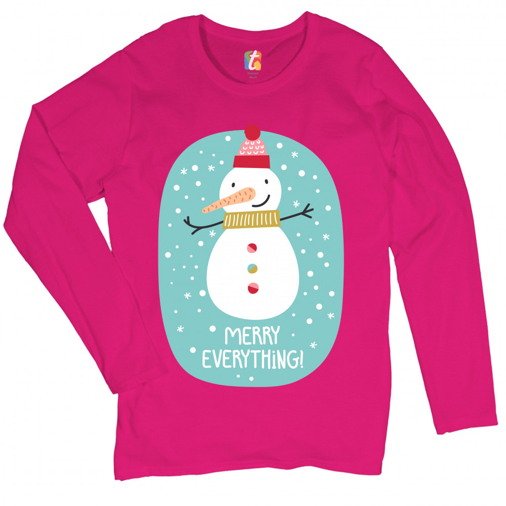 A print featuring a happy snowman with a carrot nose wearing a hat and a scarf smiling and spreading it's hands. It is snowing and below the snowman it says: "Merry Christmas". Amazing choice to make people smile and spread positive vibes on Christmas Eve