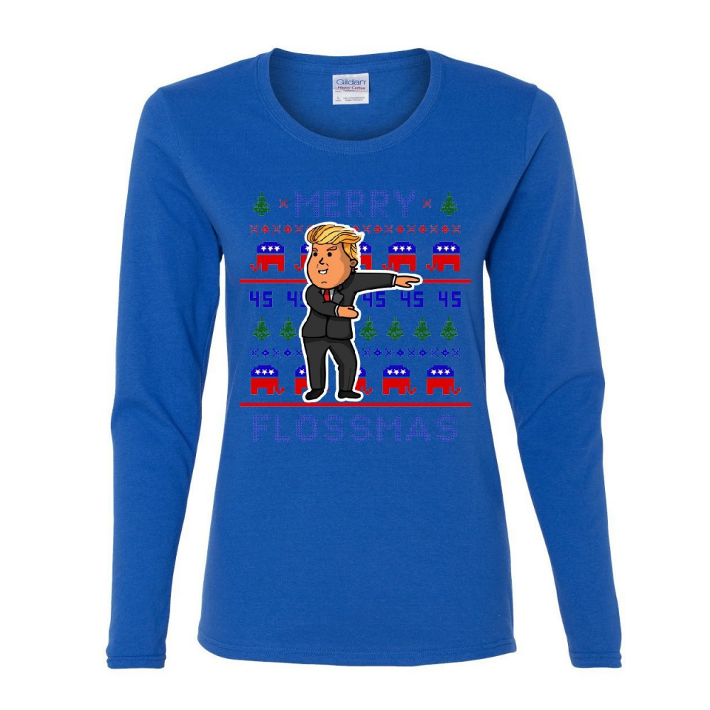 MERRY FLOSSMASS merry flossmas women's long sleeve tee christmas xmas ugly sweater trump floss royal blue