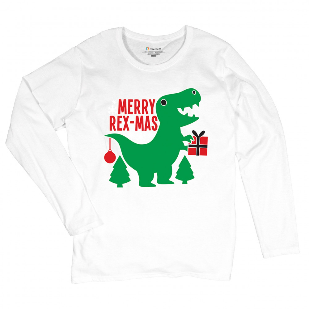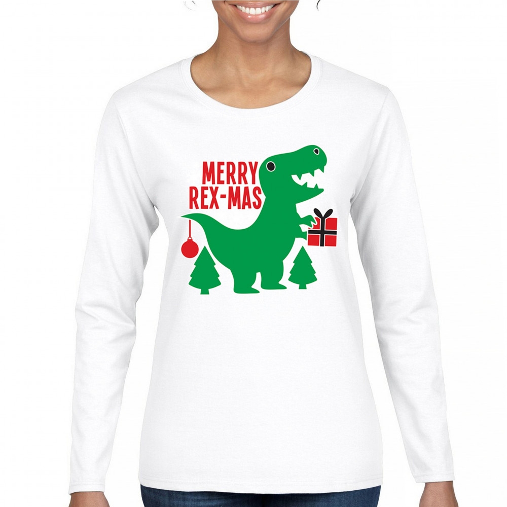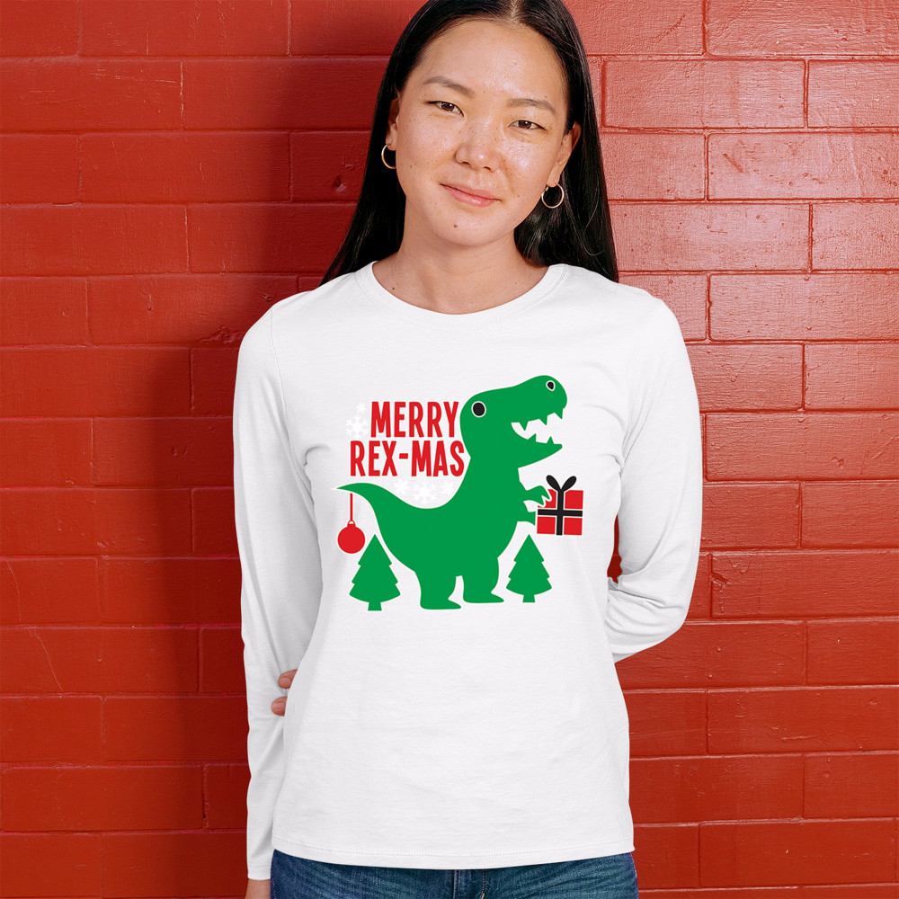 Merry Rex-Mas dinosaur Christmas design with a cute T-Rex, gift, and festive holiday details. Perfect for fun family celebrations and cheerful winter style.