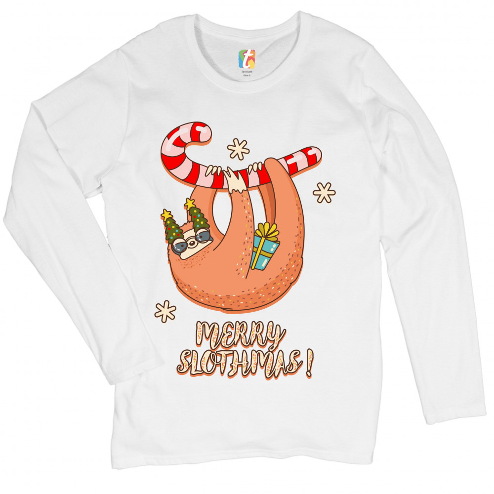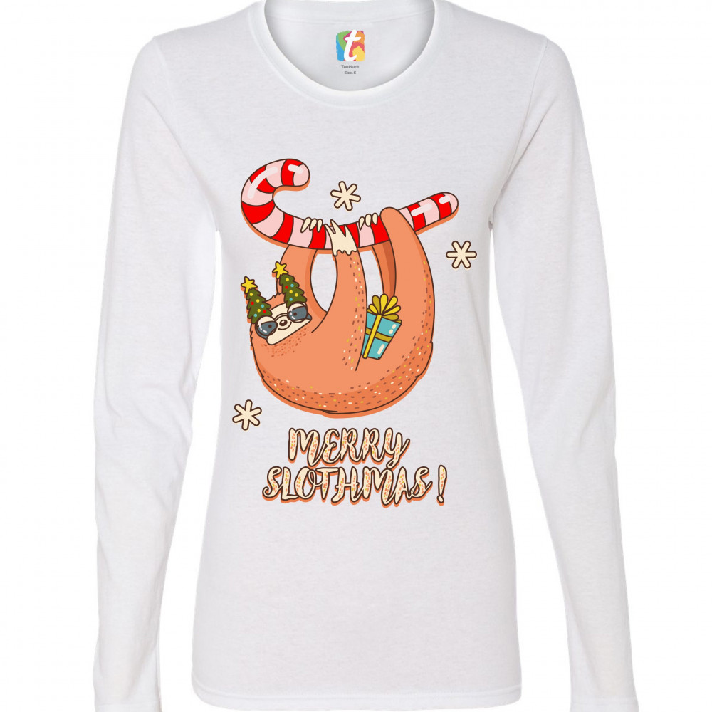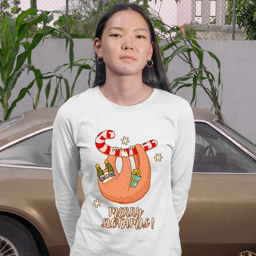 MERRY SLOTHMAS women's long sleeve t-shirt christmas sloth candy cane xmas white