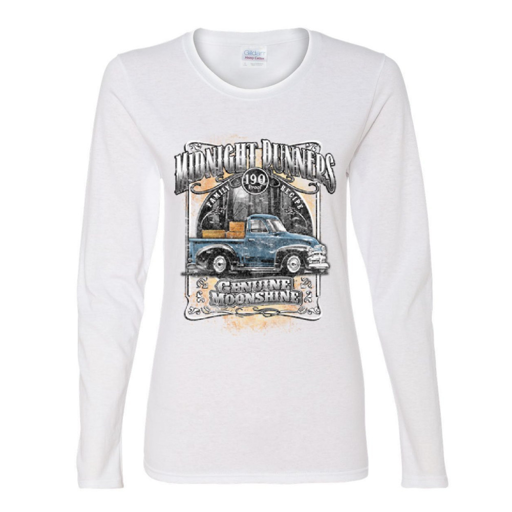 MIDNIGHT RUNNERS women's long sleeve tee genuine moonshine drinking whisky booze white