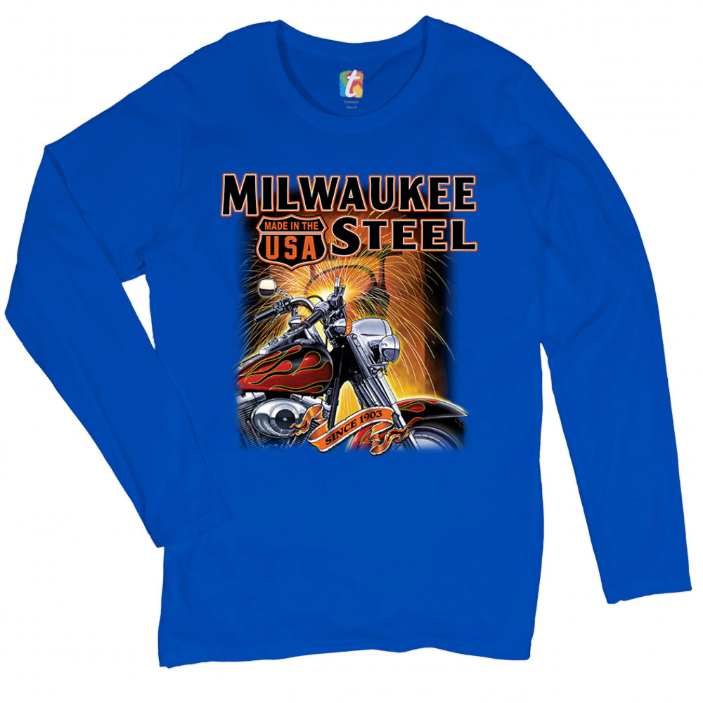 MILWAUKEE STEEL women's long sleeve t-shirt route 66 motorcycle chopper biker royal blue