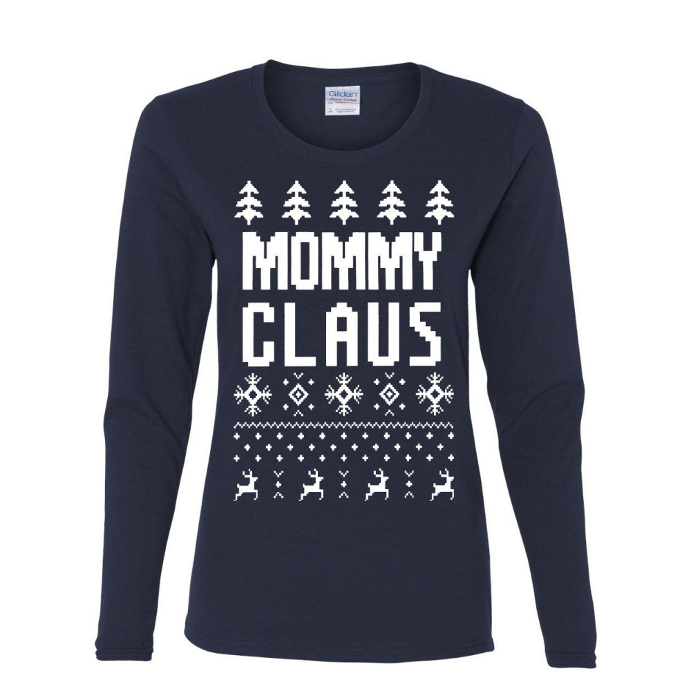 MOMMY CLAUS women's long sleeve tee funny ugly sweater santa christmas xmas navy blue