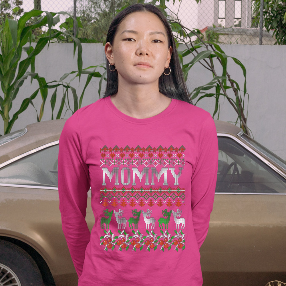 A print saying: "Mommy" and featuring six reindeers. The print is designed as an ugly sweater. Amazing choice to make people smile and spread positive vibes on Christmas Eve.