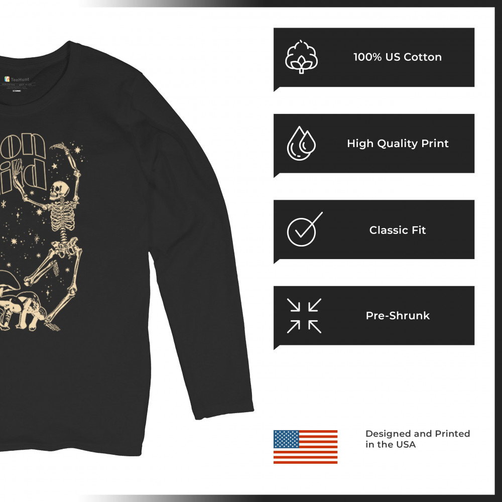 Step into cosmic wonder with this “Moon Child†design—featuring a skeleton in motion beneath a crescent moon, surrounded by stars and enchanted mushrooms. A perfect mix of gothic energy, lunar love, psychedelic art, and spiritual vibes. Ideal for festivals, vintage dreamers, or anyone guided by moonlight and magic.