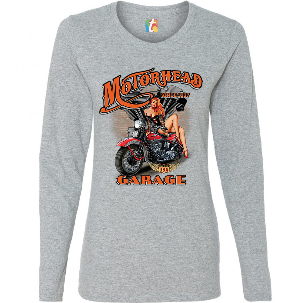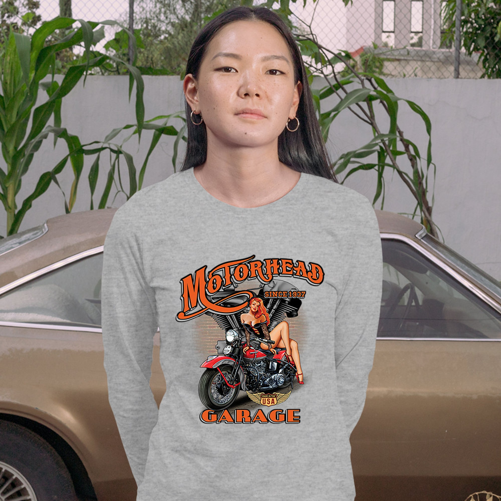 A print featuring a sexy pin-up girl sitting on a motorcycle. In the background there is a motorcycle engine and a brick wall. The print says: "Motorhead Garage since 1937" and features a "Made in the USA" sign. A great choice for a motorcycle enthusiast.