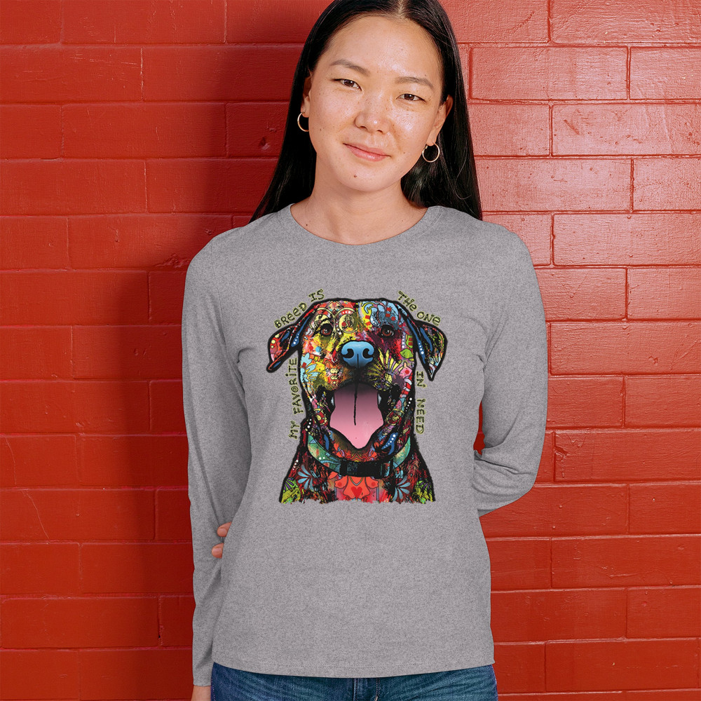 MY FAVORITE BREED IS THE ONE IN NEED women's long sleeve t-shirt dean russo dog gray