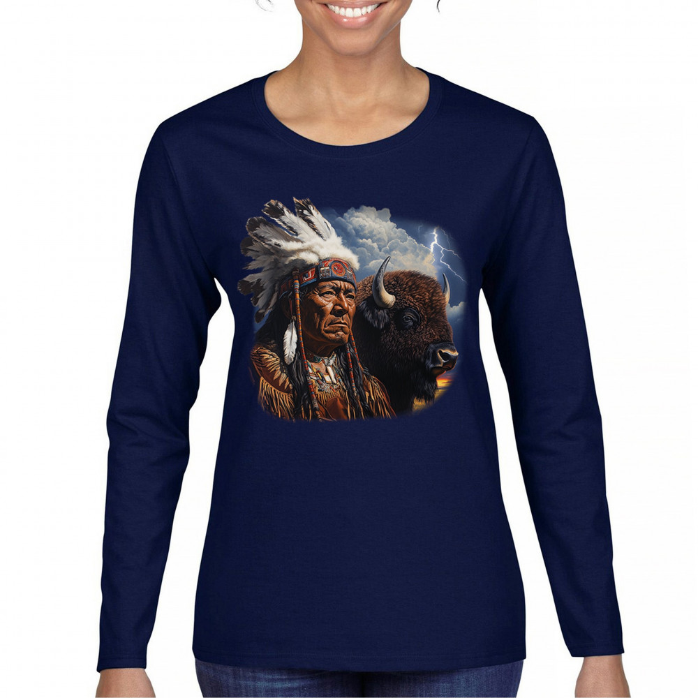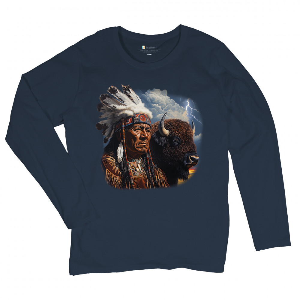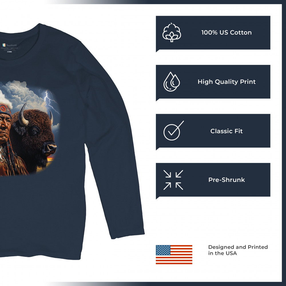 Bold tribal elder and bison design framed by lightning sky—honoring heritage, strength, resilience, and sacred connection to nature.
