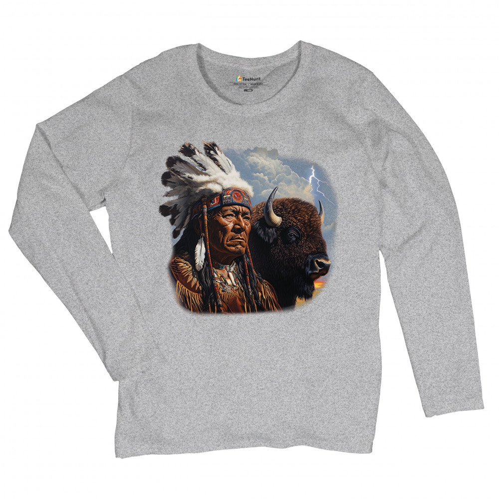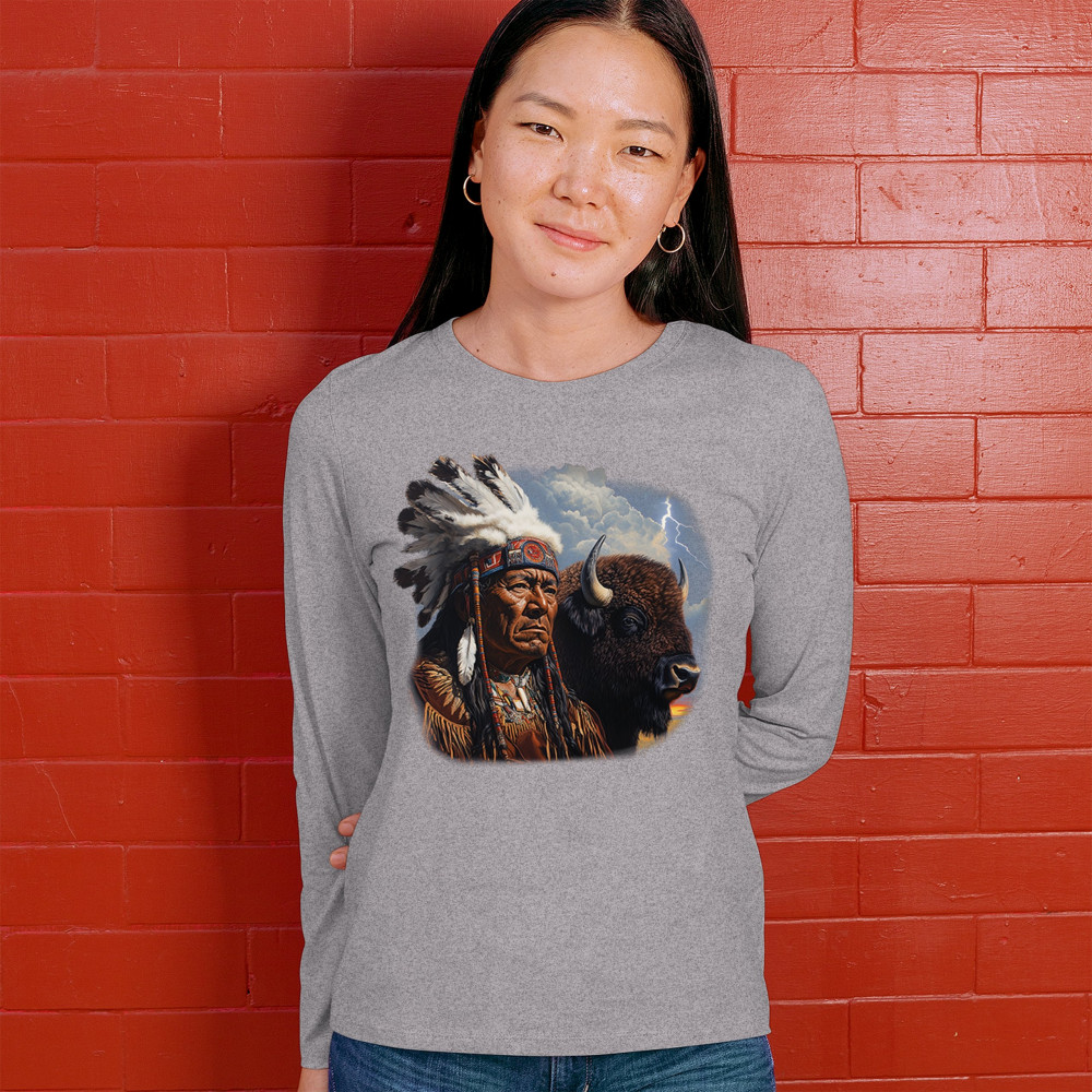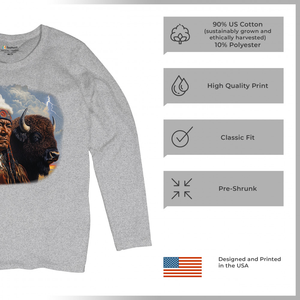 Bold tribal elder and bison design framed by lightning sky—honoring heritage, strength, resilience, and sacred connection to nature.