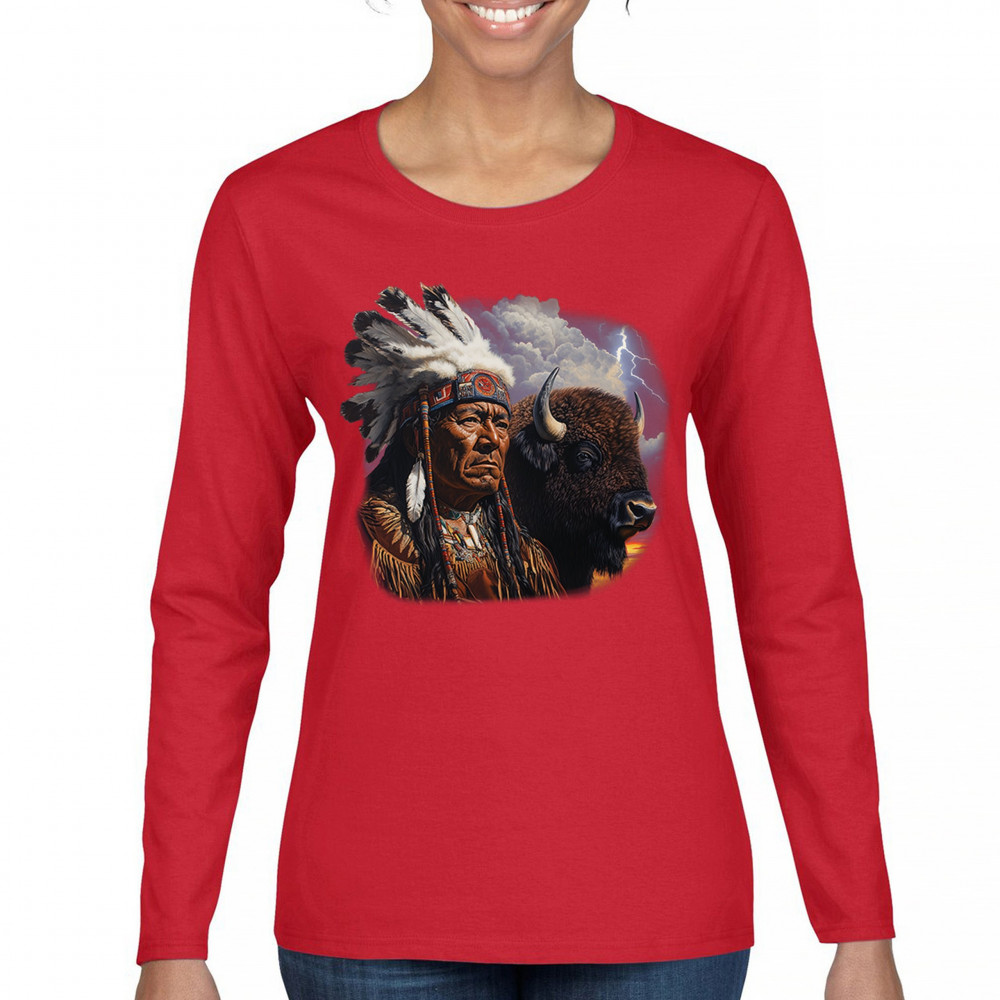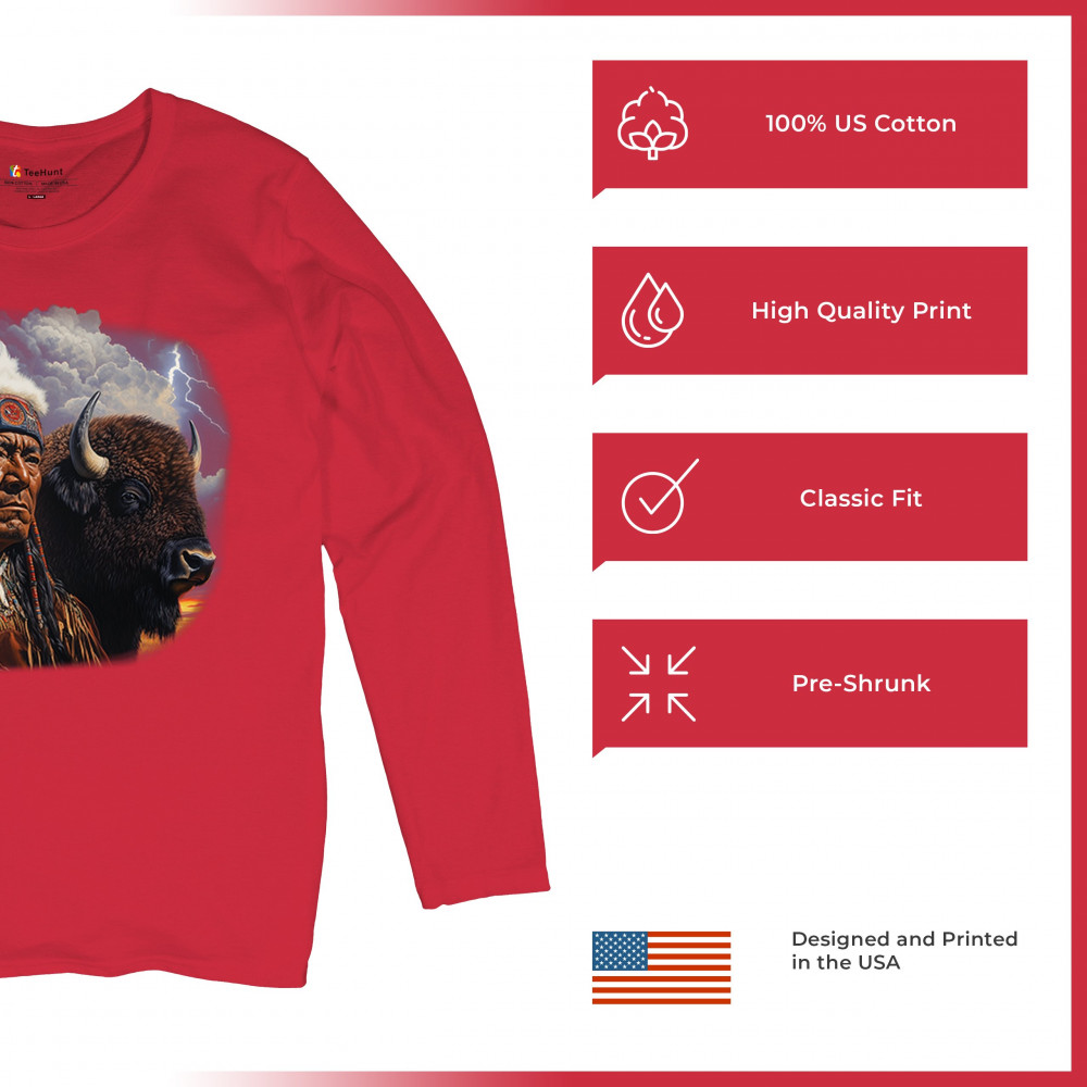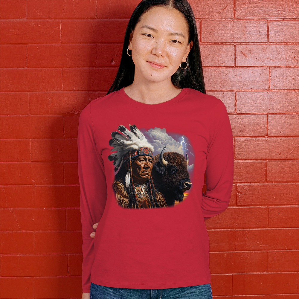 Bold tribal elder and bison design framed by lightning sky—honoring heritage, strength, resilience, and sacred connection to nature.