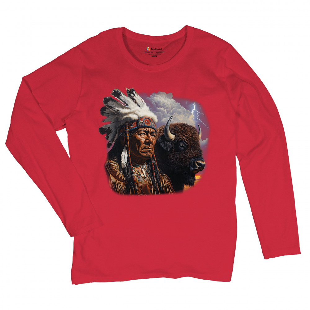 This powerful design features a Native American elder in traditional dress and feathered headdress beside a noble bison. Framed by a stormy sky and lightning, the art symbolizes tribal pride, spiritual harmony, ancestral strength, and a deep connection to nature’s raw energy.