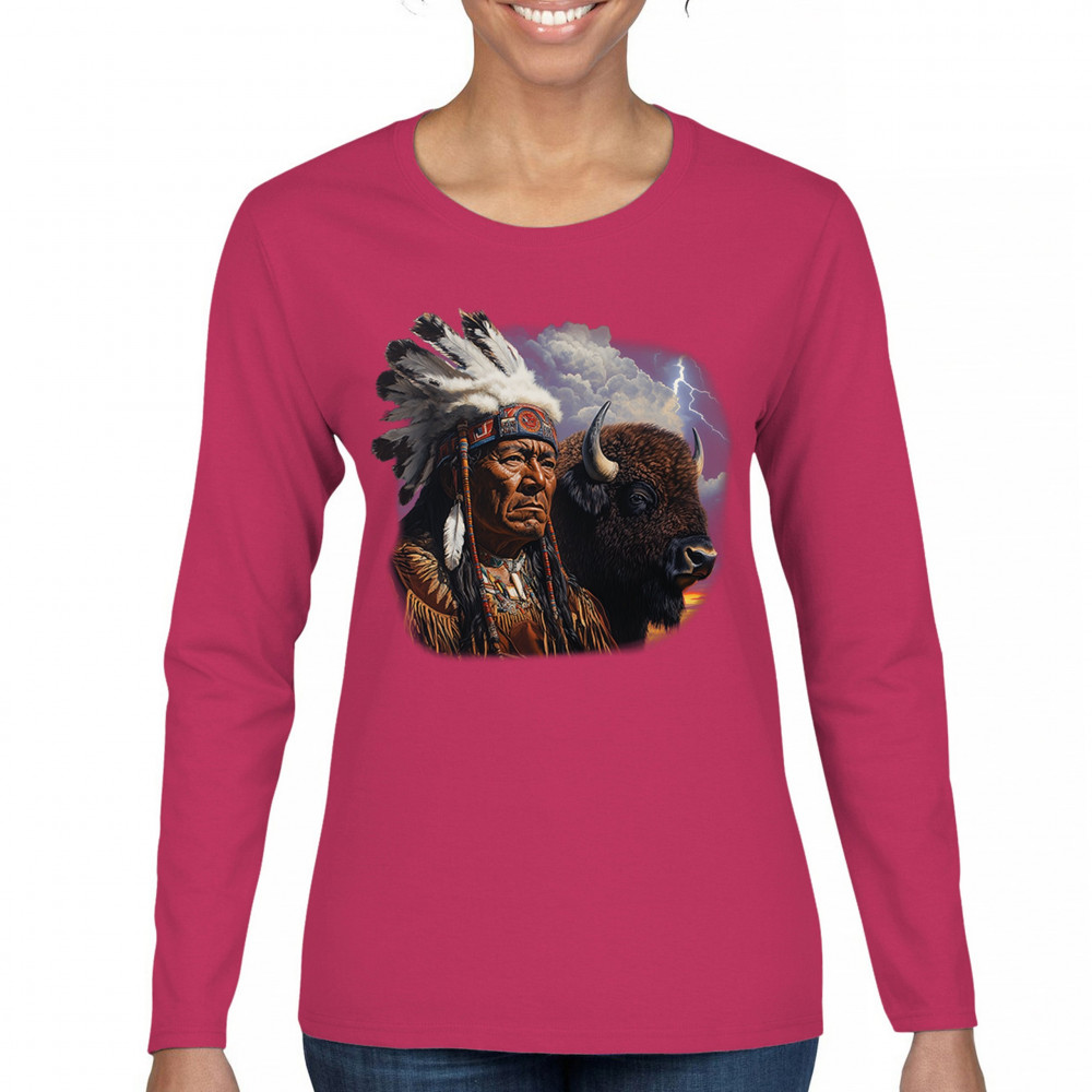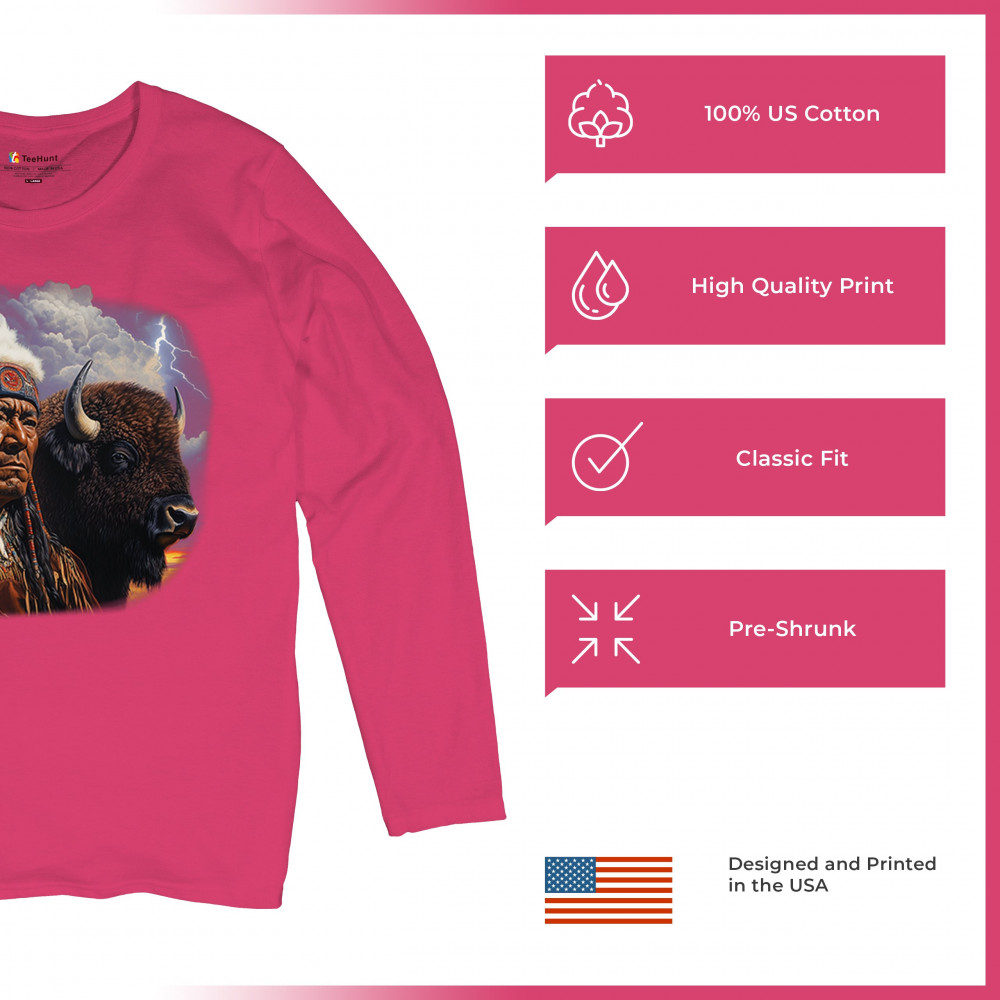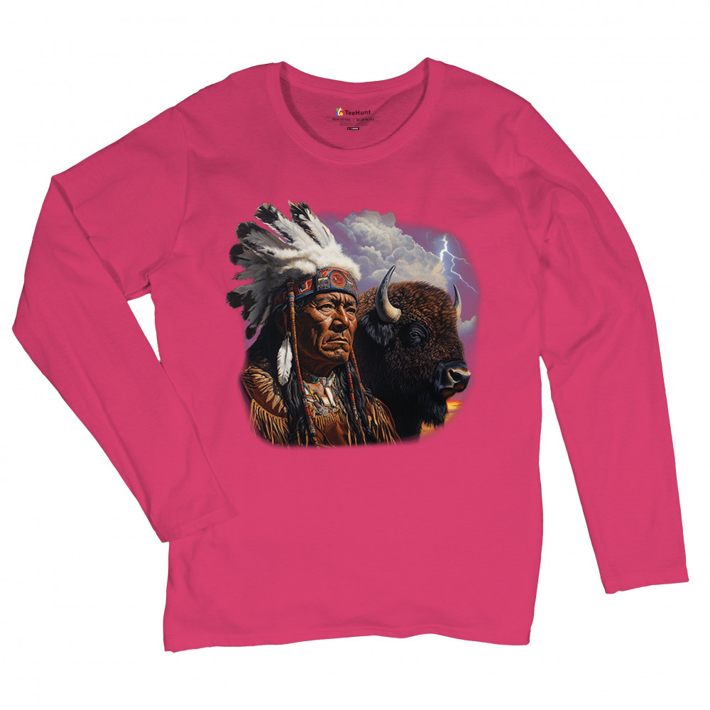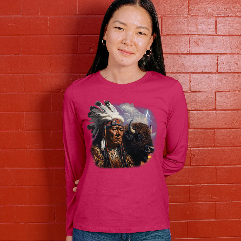 Bold tribal elder and bison design framed by lightning sky—honoring heritage, strength, resilience, and sacred connection to nature.