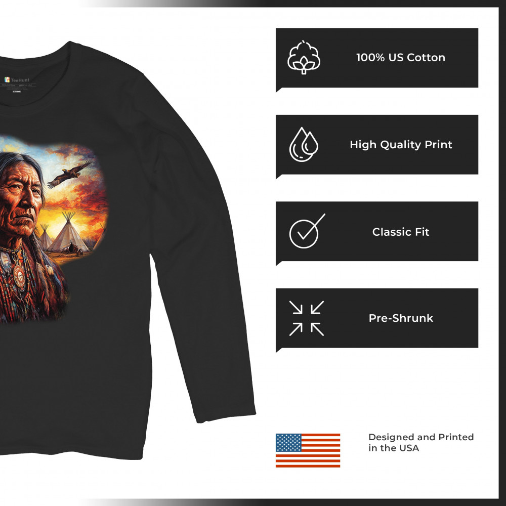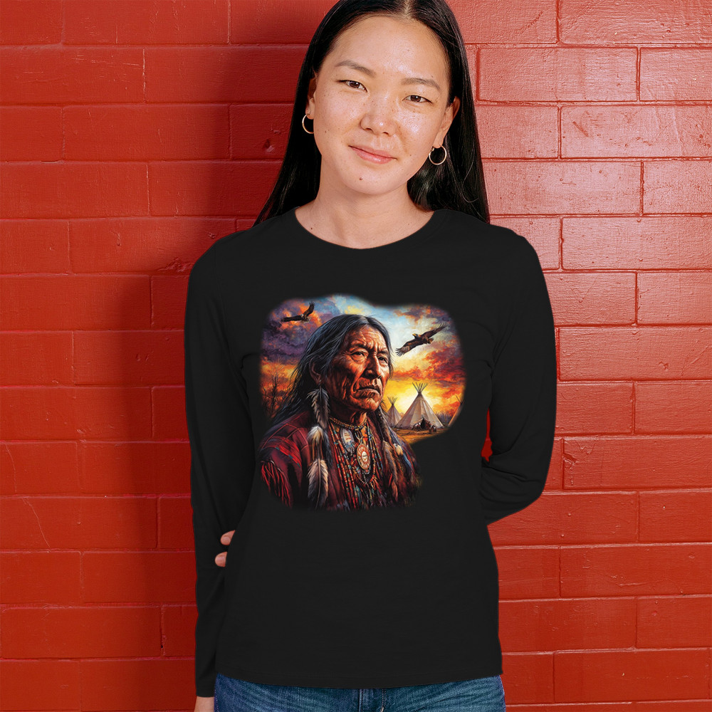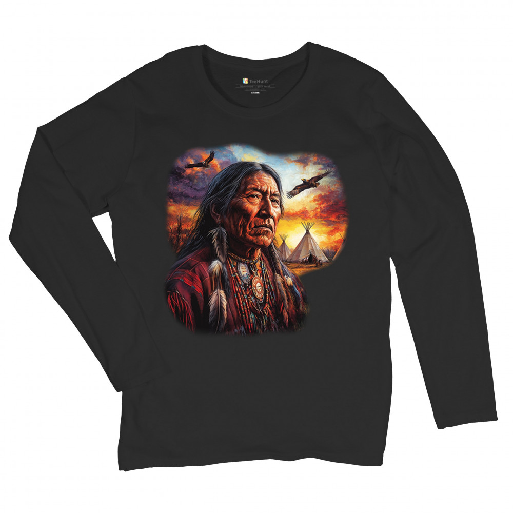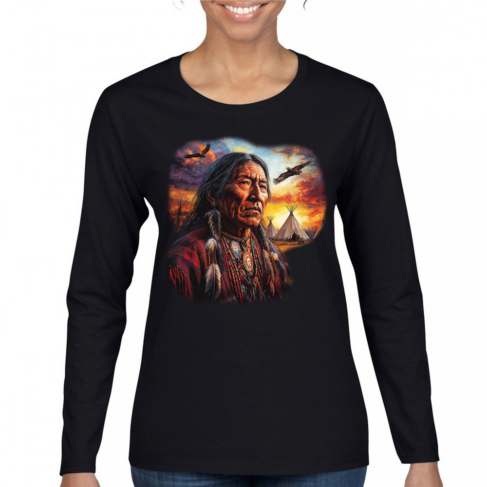 NATIVE AMERICAN VILLAGE CHIEF women's long sleeve t-shirt tribal warrior sunset black