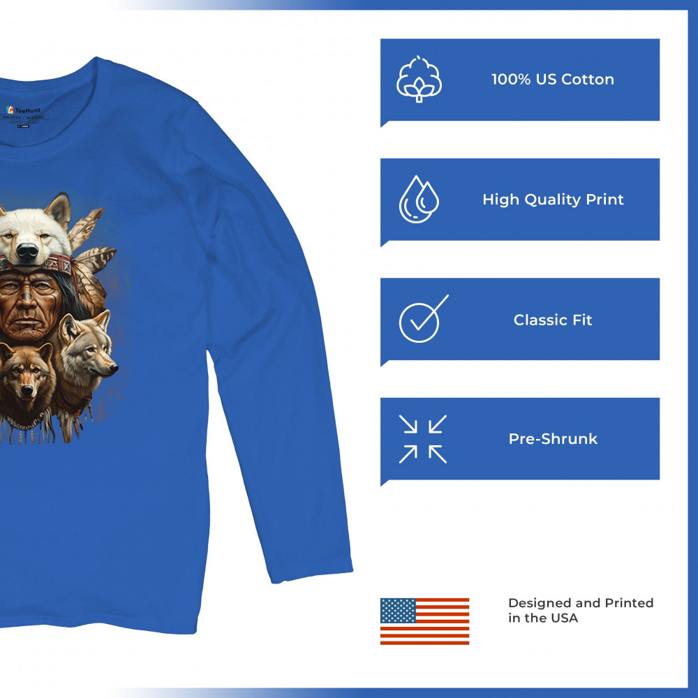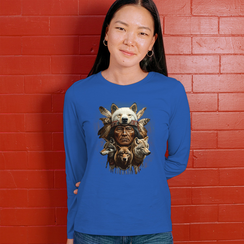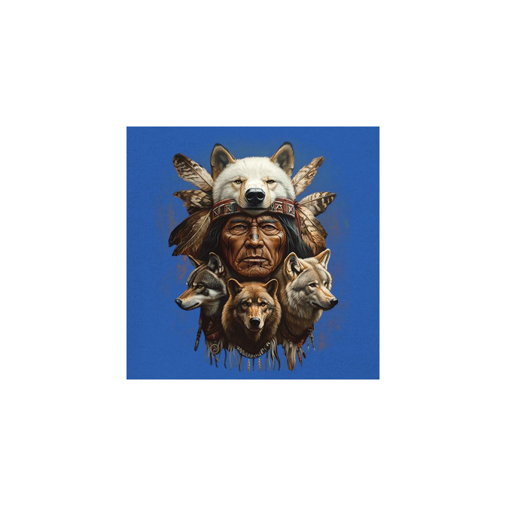 Wolf totem design with Native elder in headdress and guardian wolves. Symbolizes strength, loyalty, spirit animals, and tribal heritage.