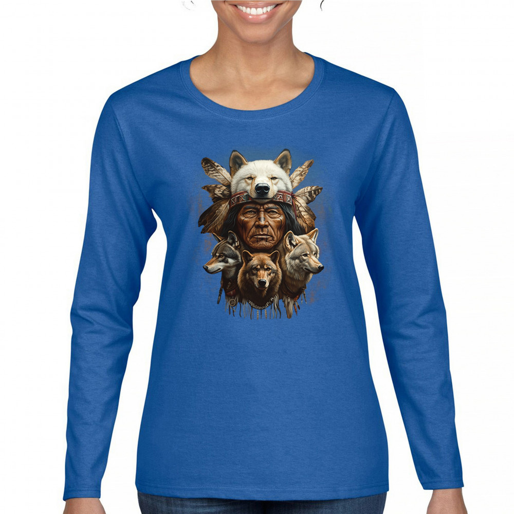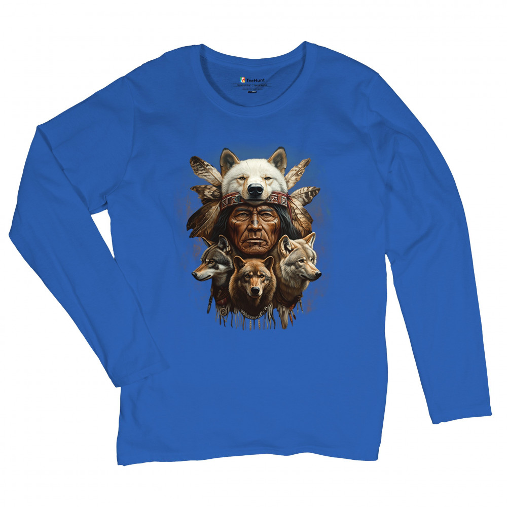 This spiritual tribal design showcases a Native American elder in a detailed wolf headdress surrounded by guardian wolves. It represents strength, loyalty, instinct, and sacred unity with nature. A powerful totem for honoring animal bonds, native pride, and ancestral spiritual guidance through the spirit of the wolf.