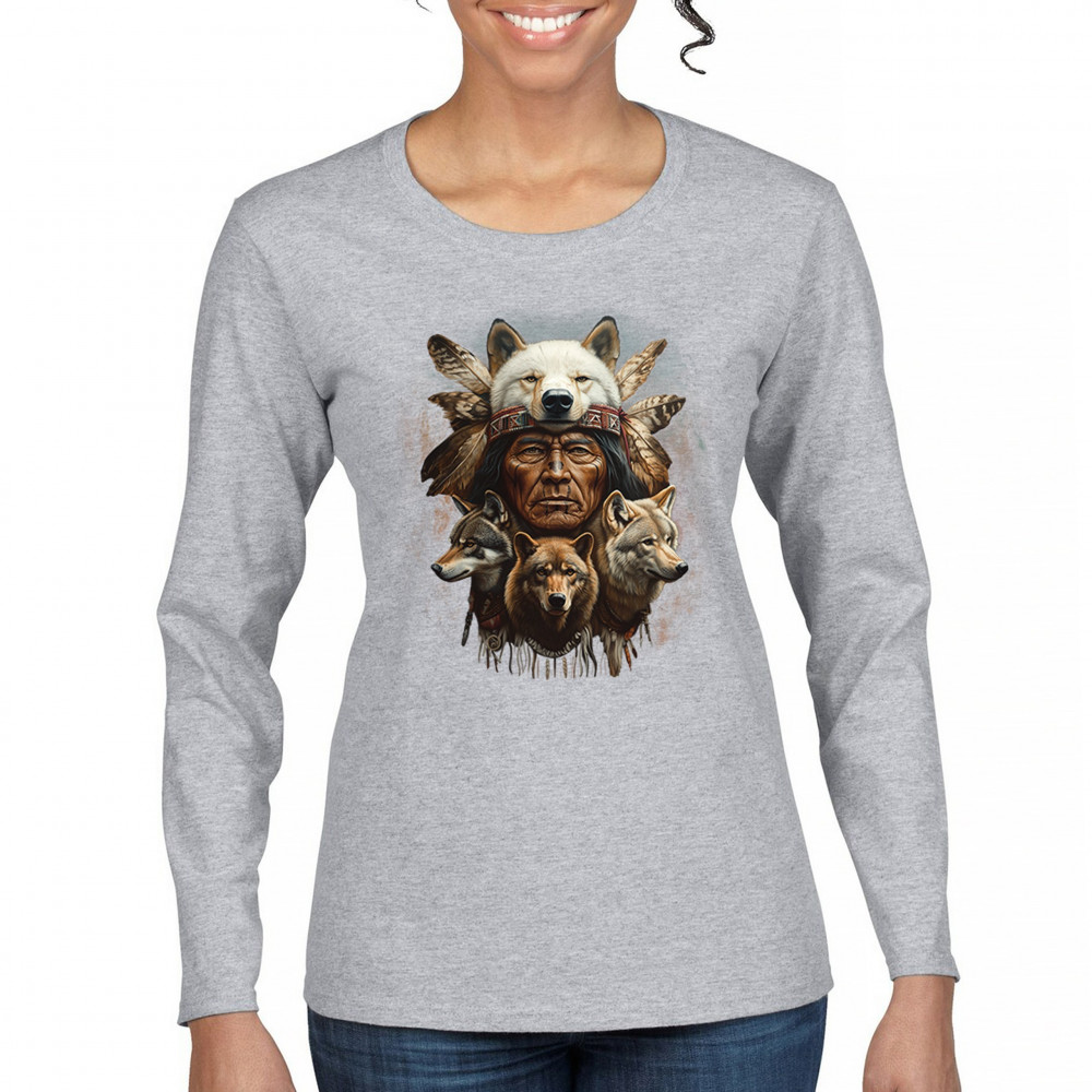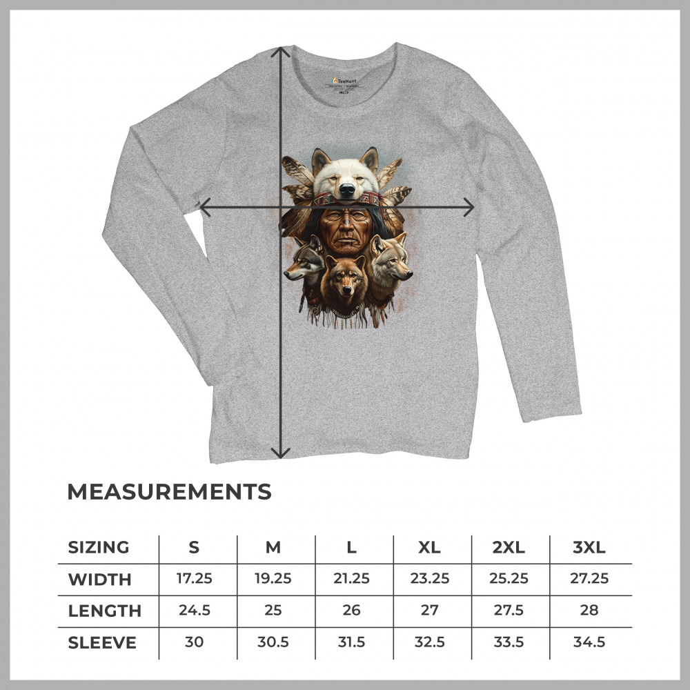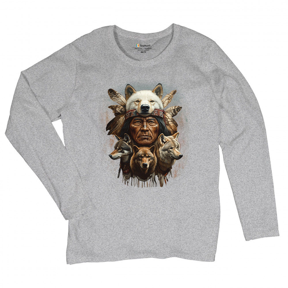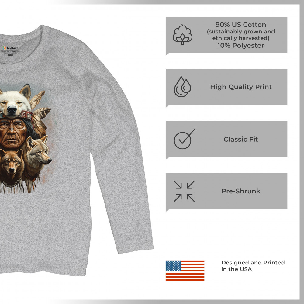 Wolf totem design with Native elder in headdress and guardian wolves. Symbolizes strength, loyalty, spirit animals, and tribal heritage.