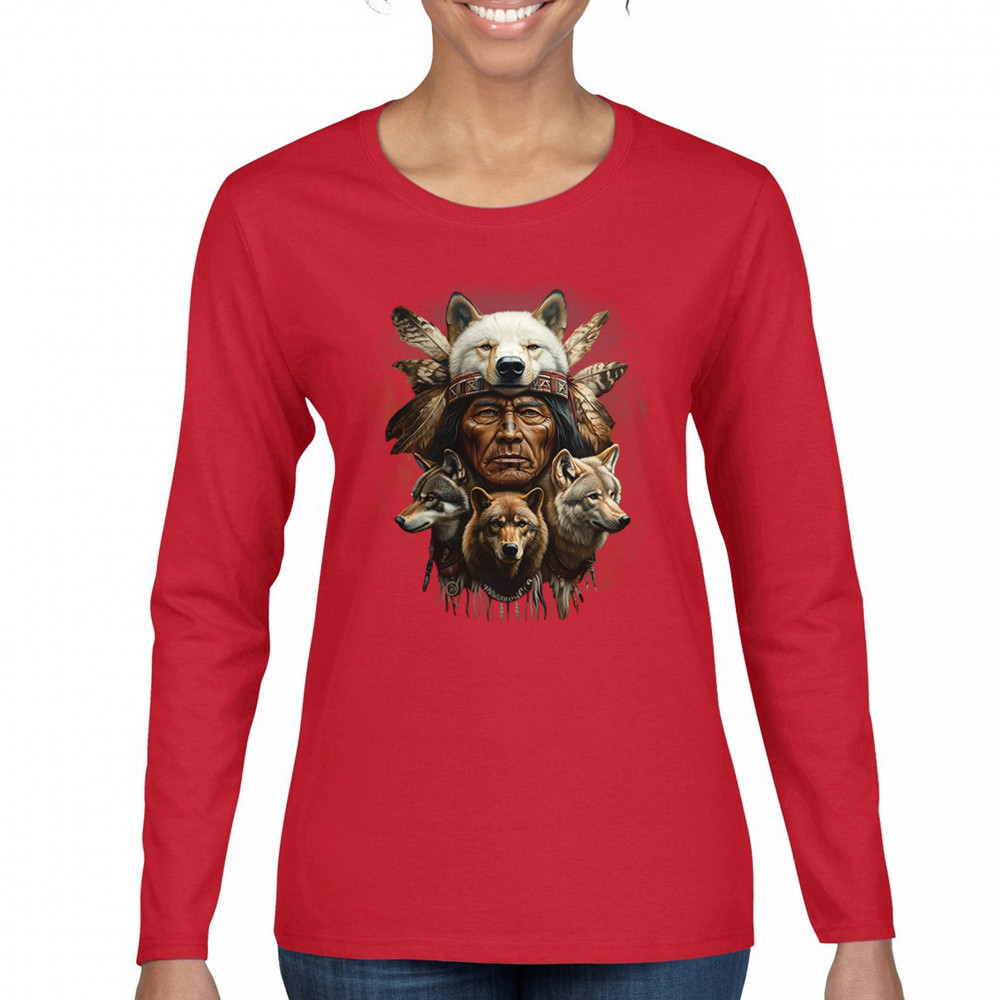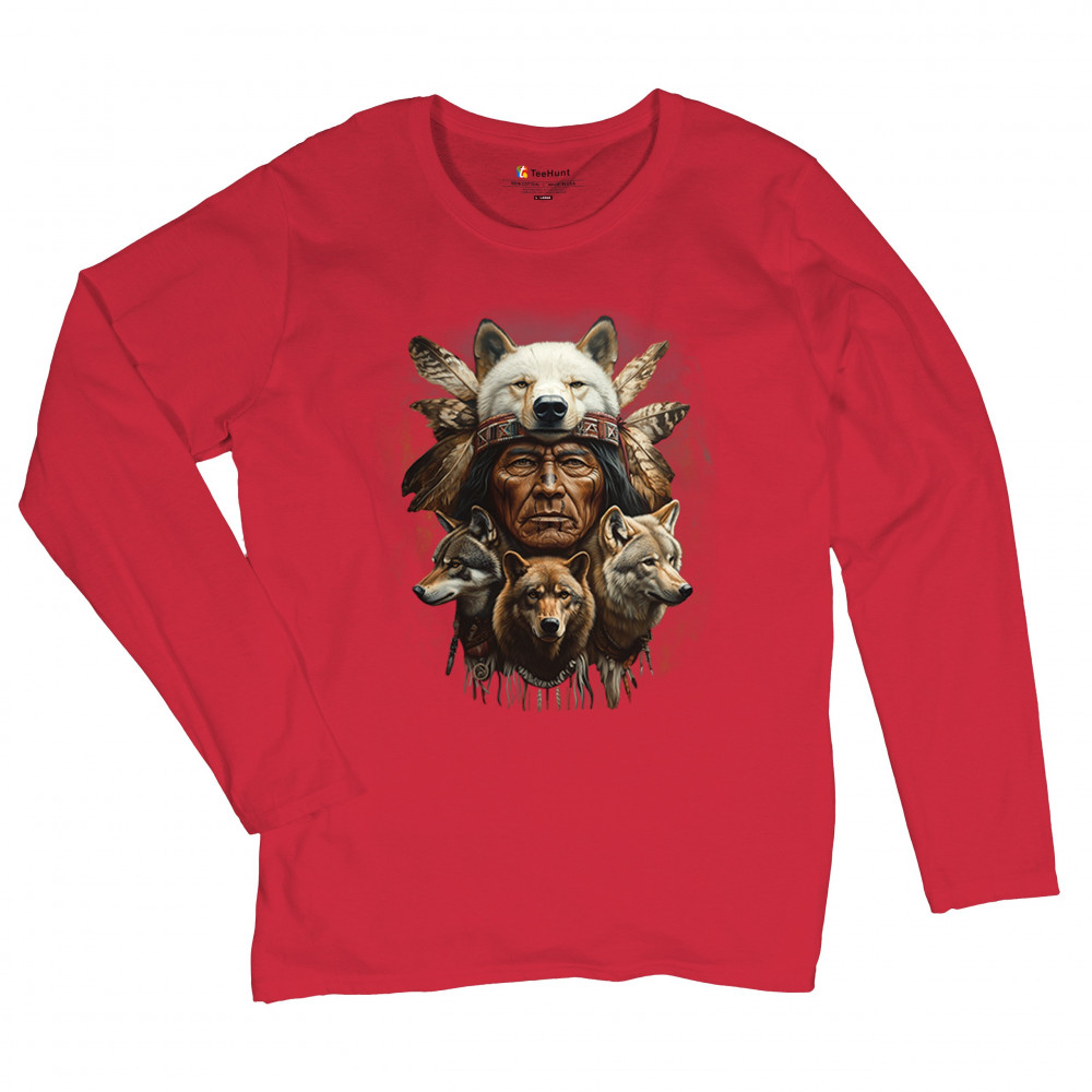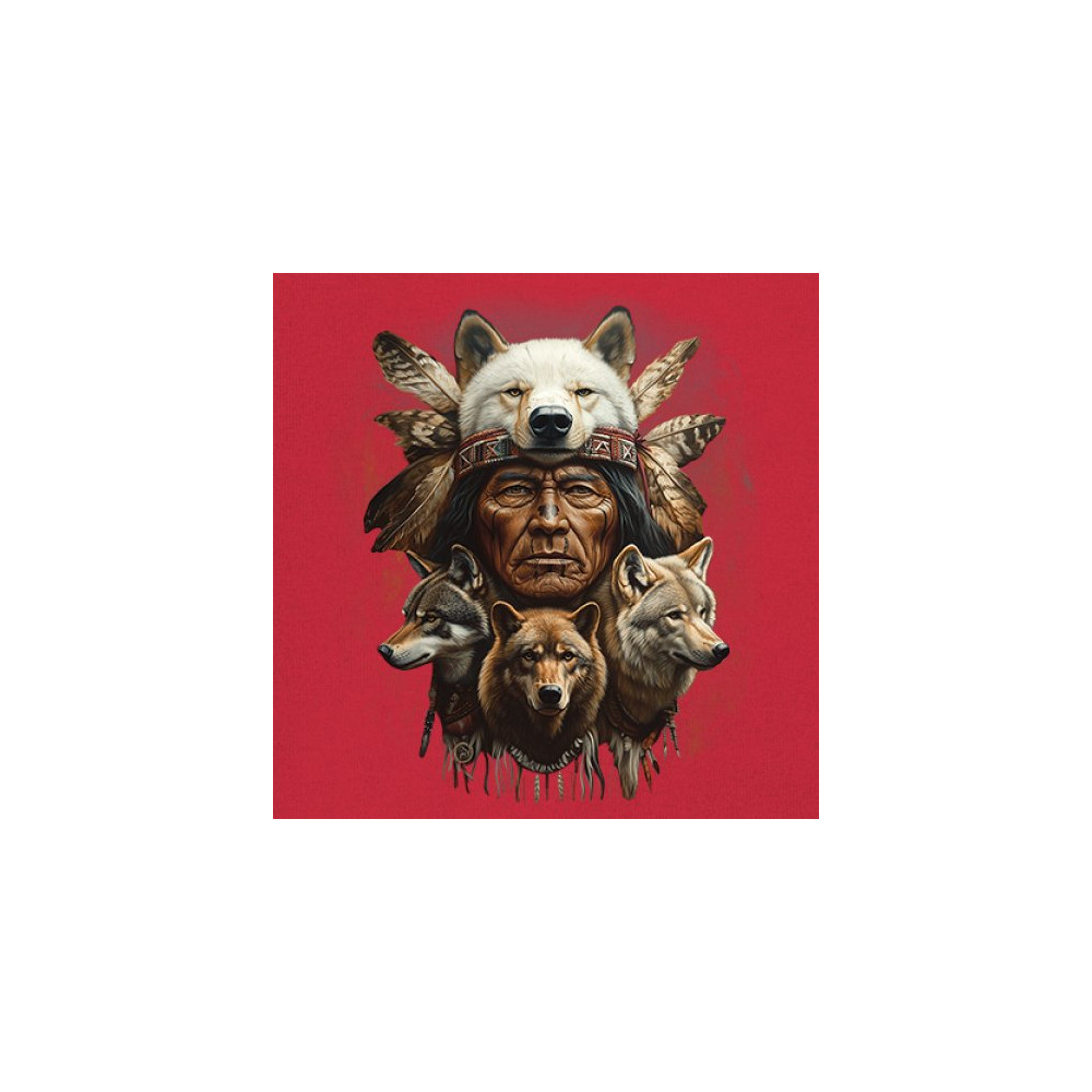 Wolf totem design with Native elder in headdress and guardian wolves. Symbolizes strength, loyalty, spirit animals, and tribal heritage.
