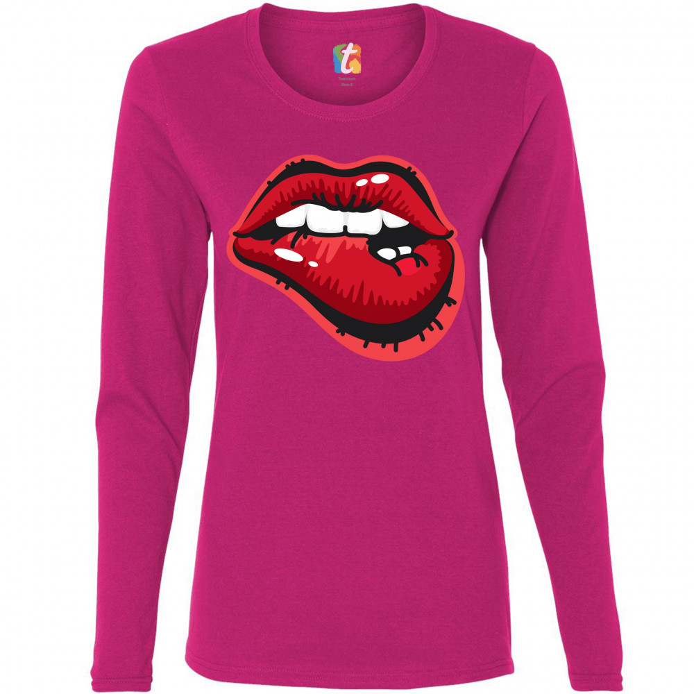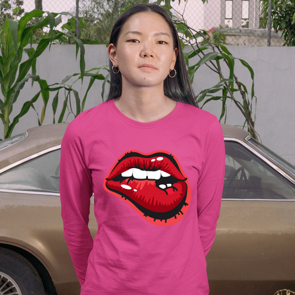 NAUGHTY BITING LIPS women's long sleeve t-shirt hot luscious sexy red lips pink