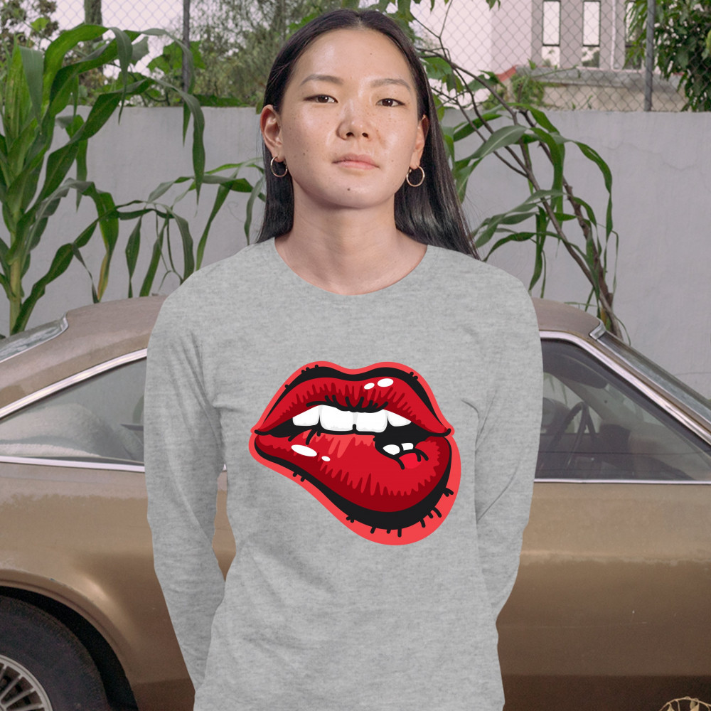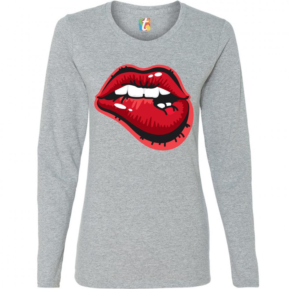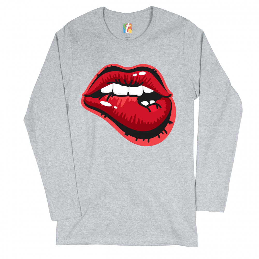 NAUGHTY BITING LIPS women's long sleeve t-shirt hot luscious sexy red lips gray