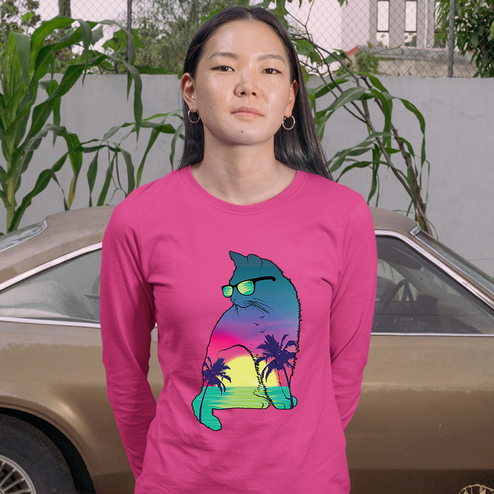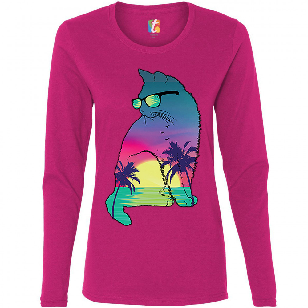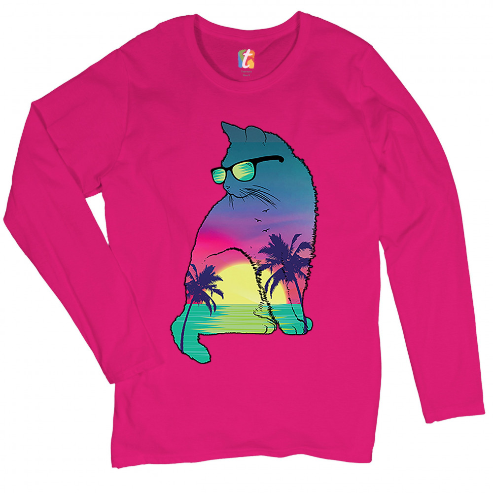 NEON CAT IN SUNGLASSES women's long sleeve t-shirt tropic kitten summer kitty pink