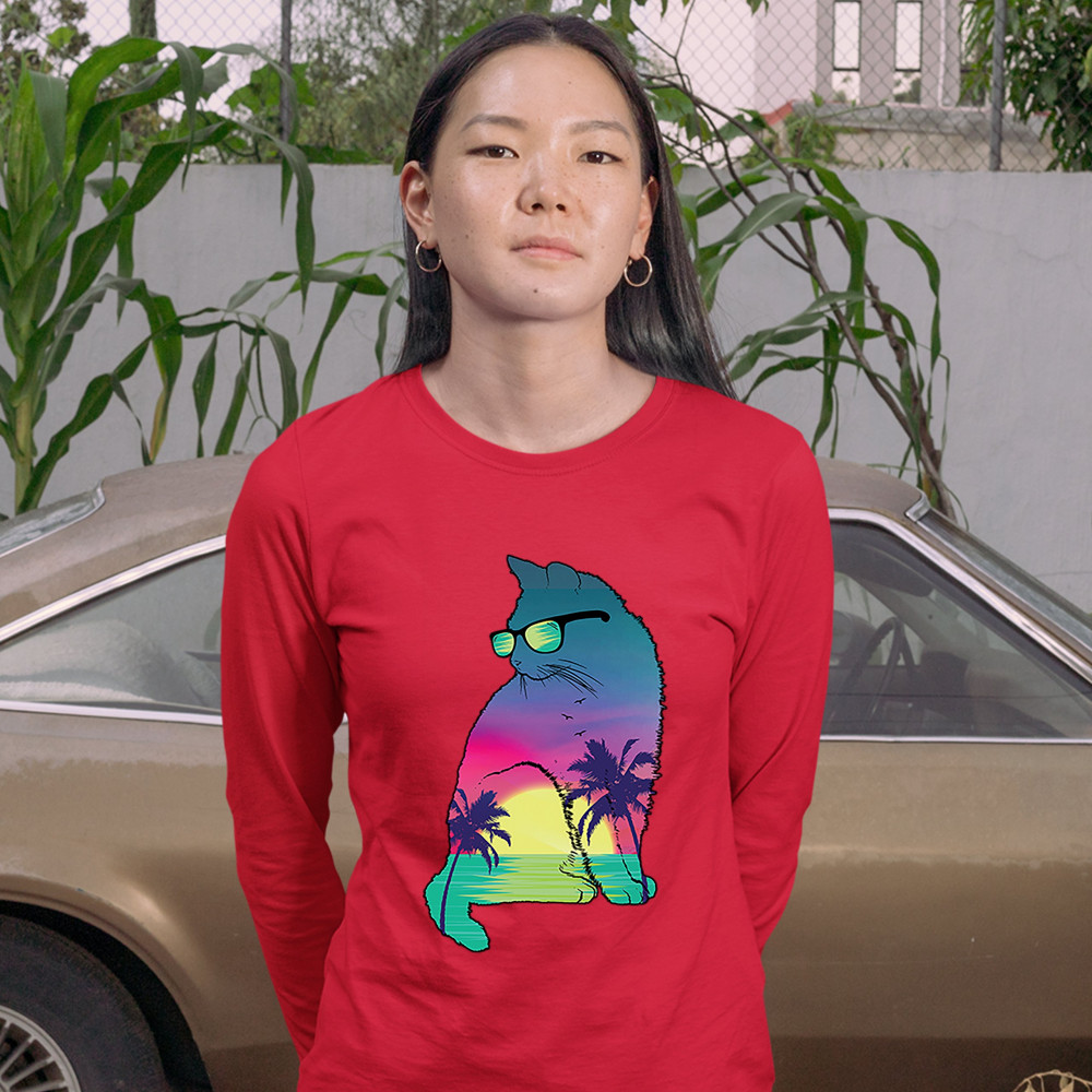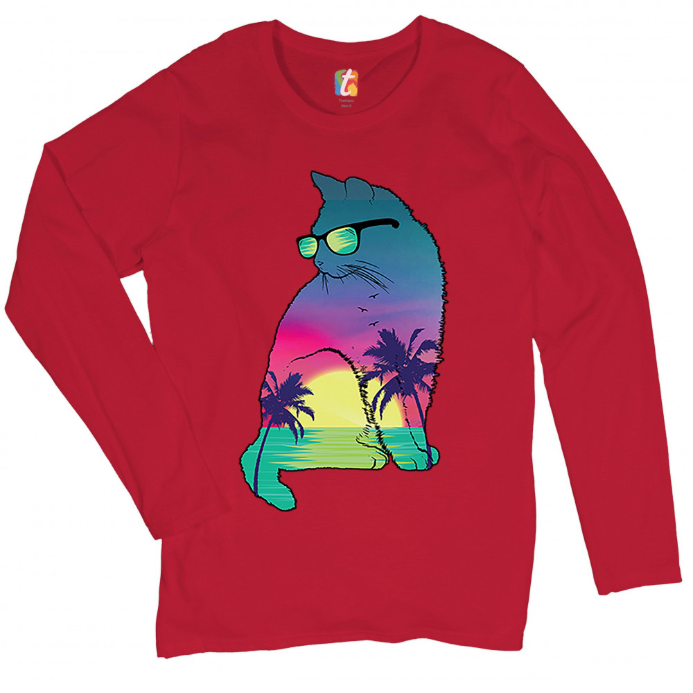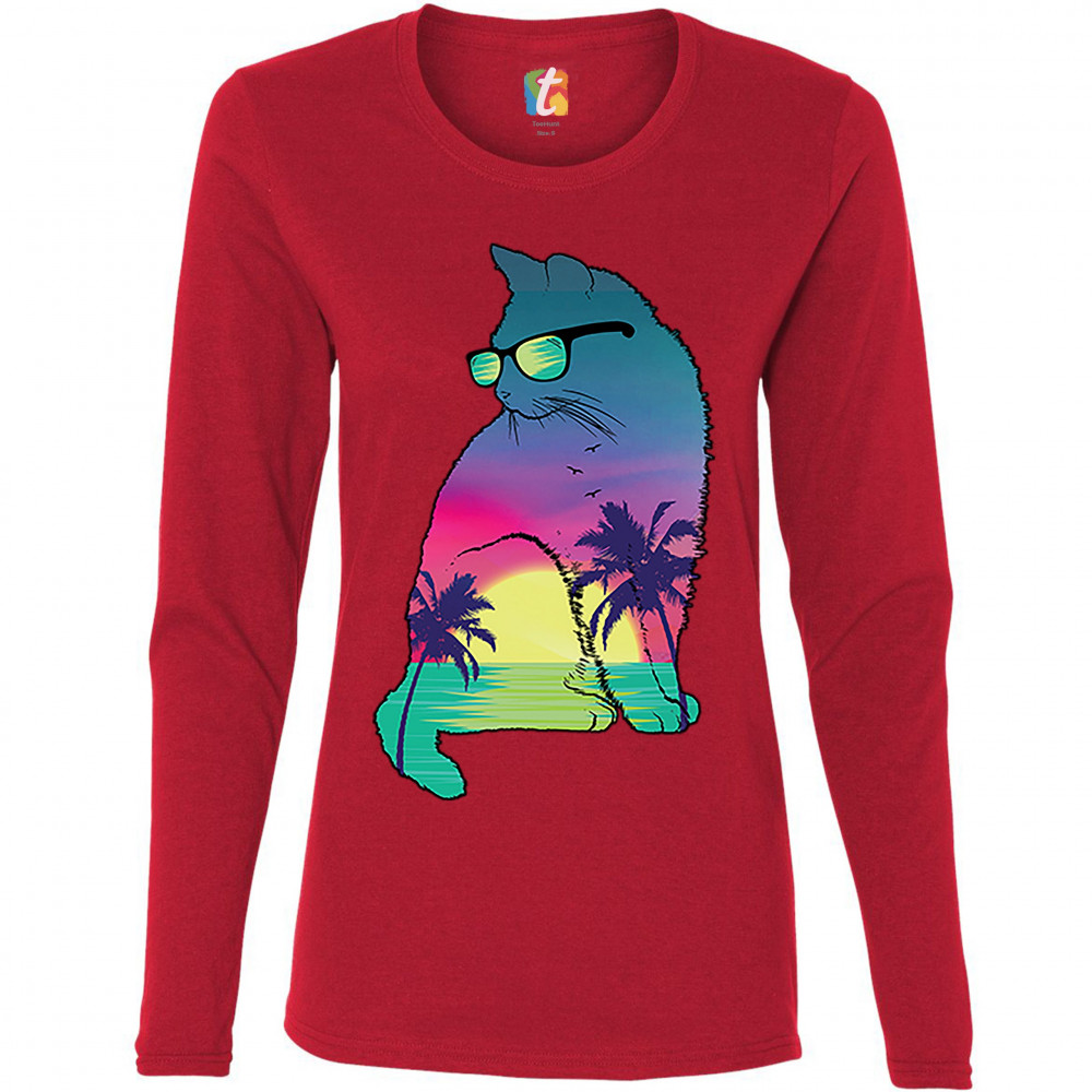 NEON CAT IN SUNGLASSES women's long sleeve t-shirt tropic kitten summer kitty red