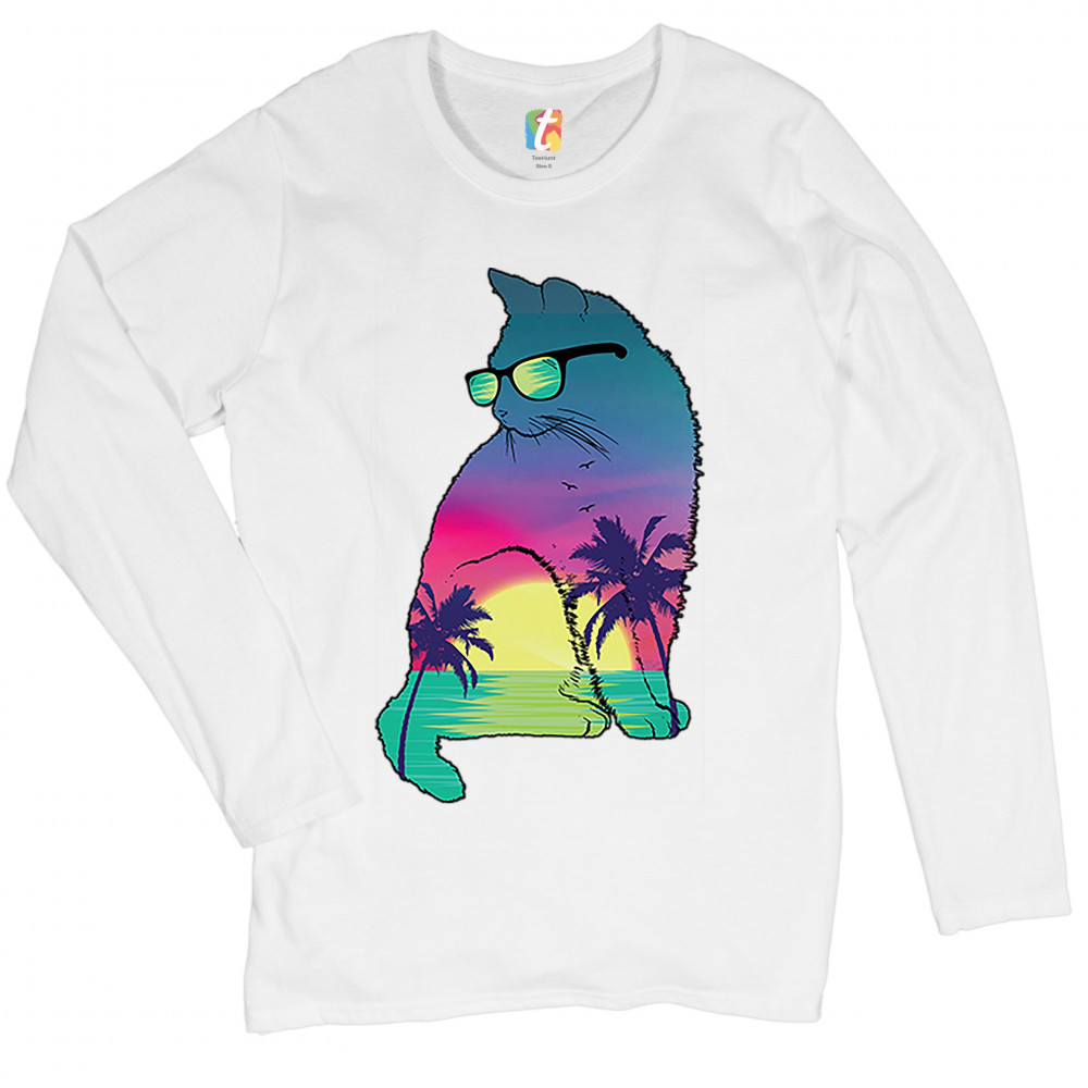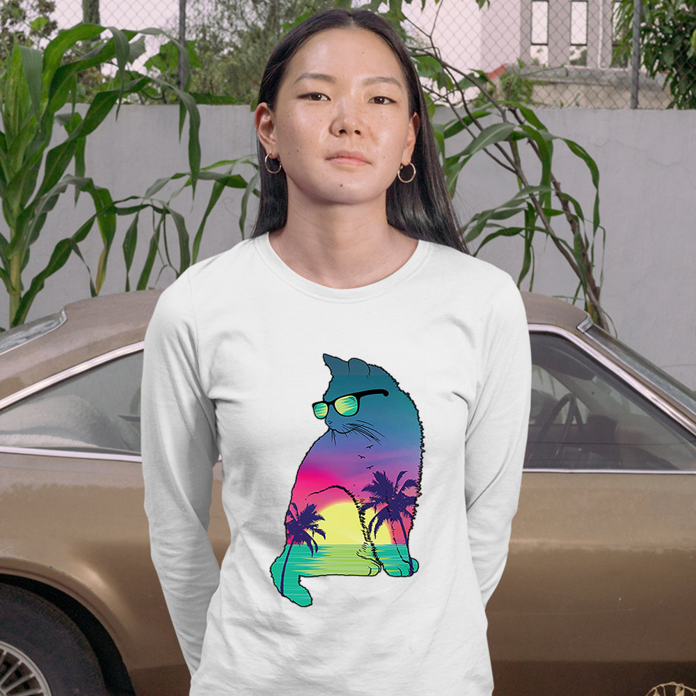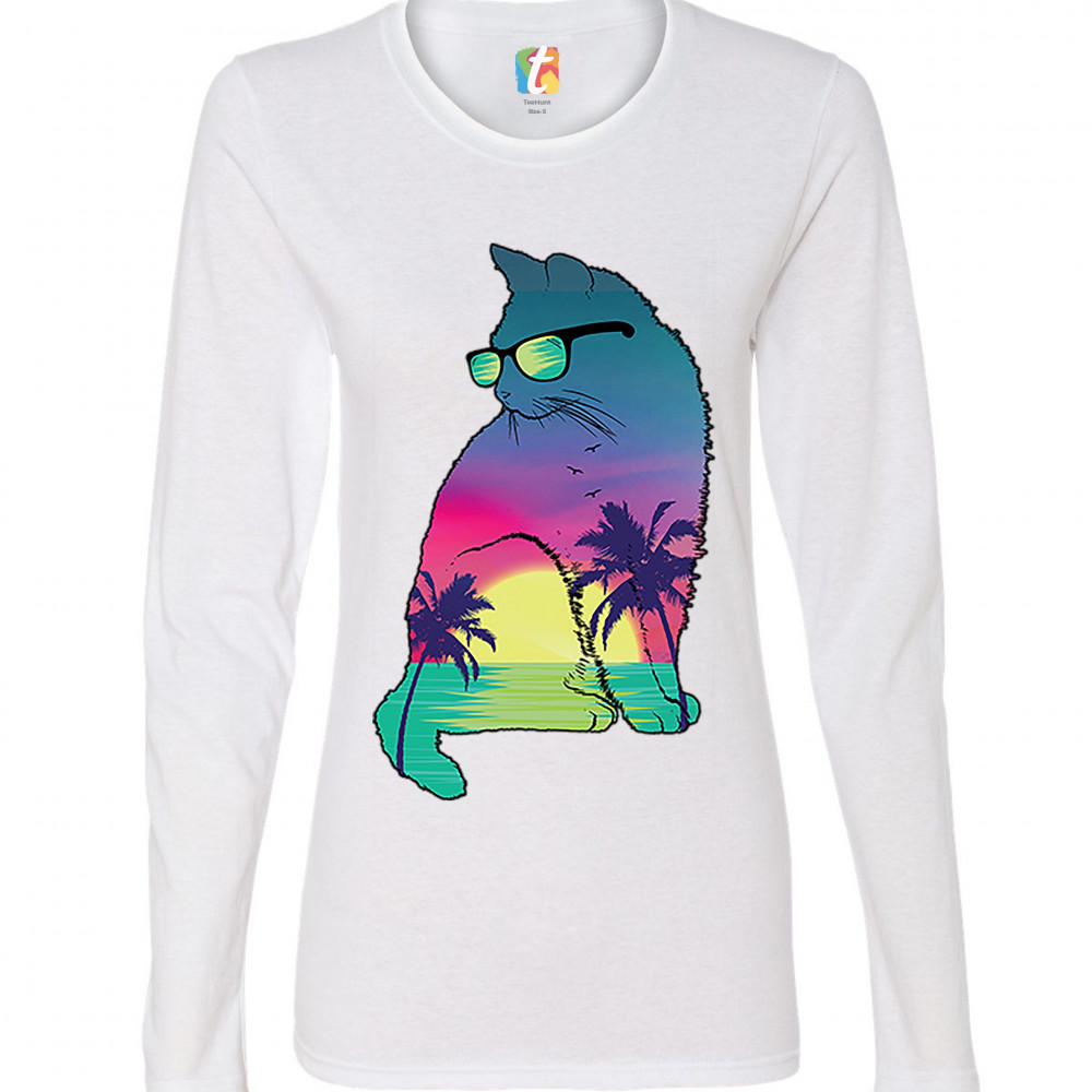 NEON CAT IN SUNGLASSES women's long sleeve t-shirt tropic kitten summer kitty white