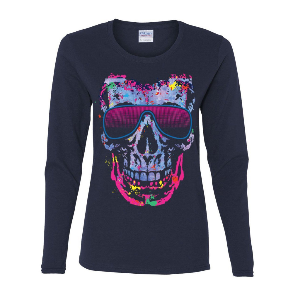 NEON SKULL SUNGLASSES women's long sleeve tee swag multicolor music edm rave pop navy blue