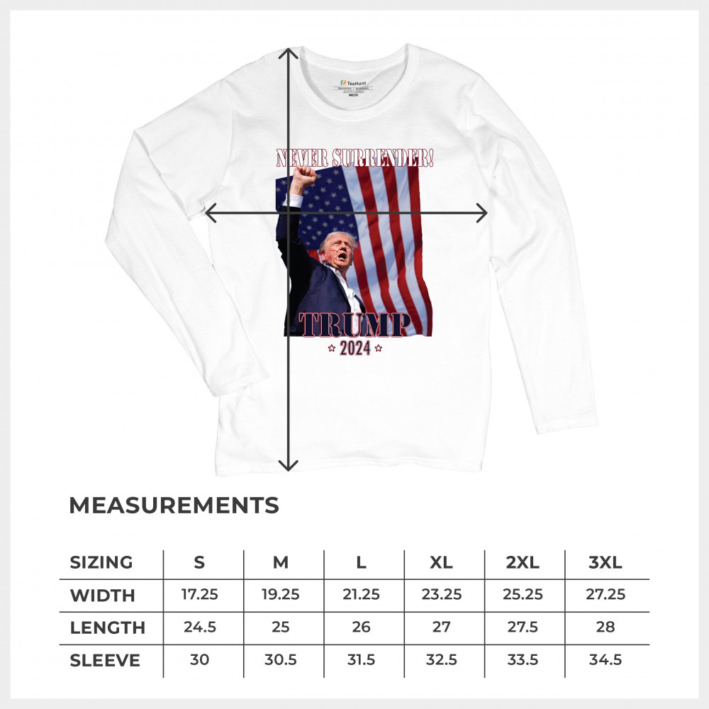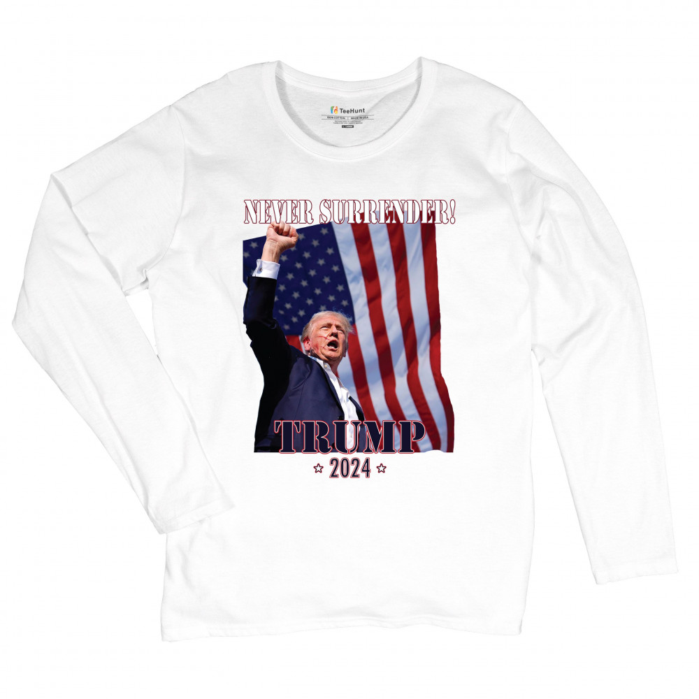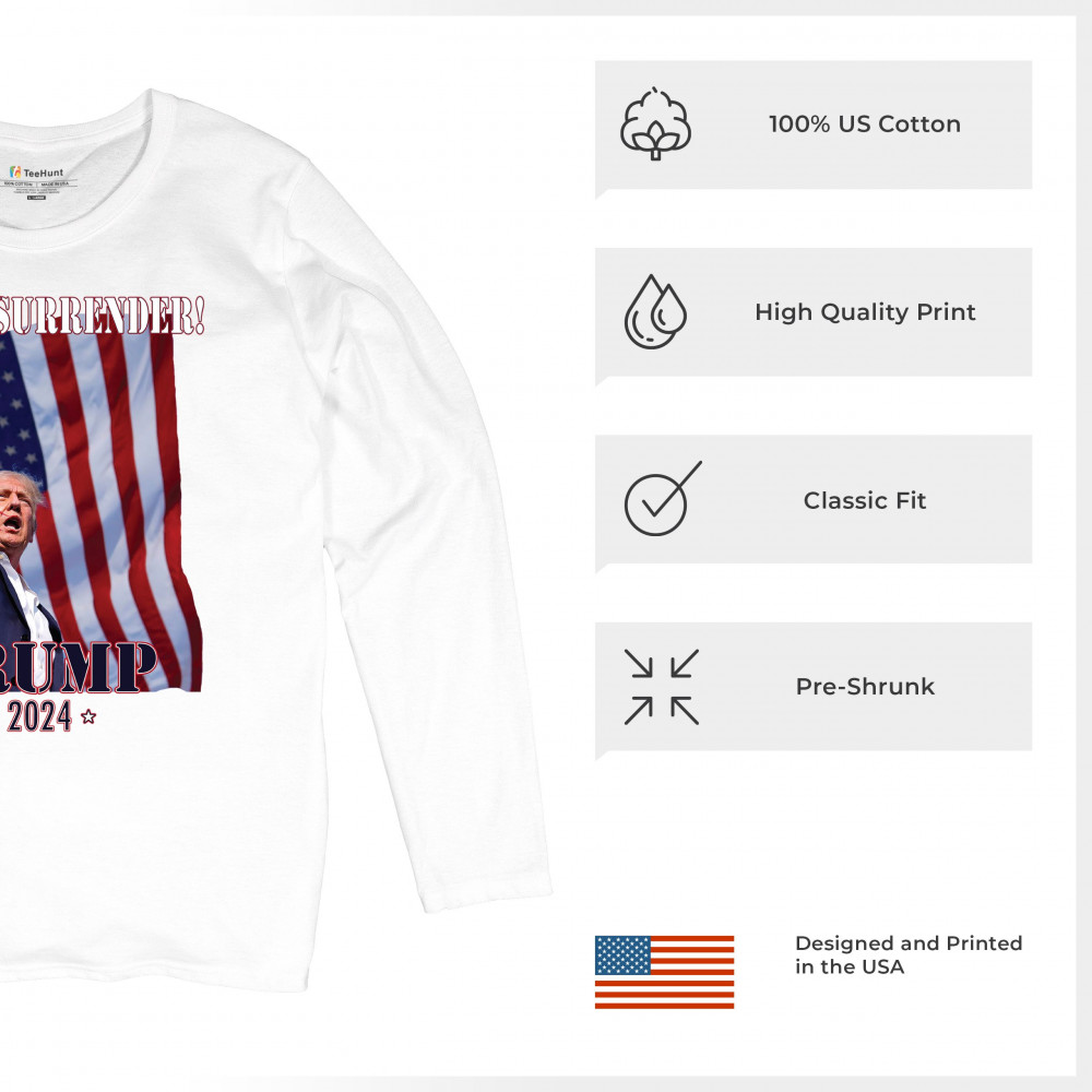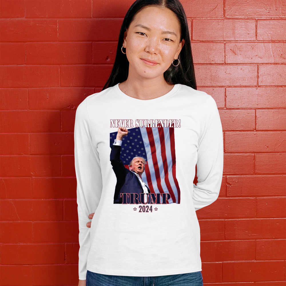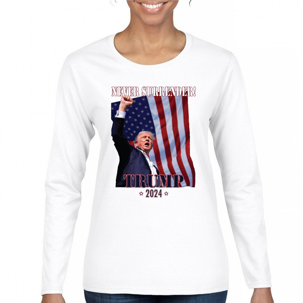Support Donald Trump with our bold "Never Surrender! Trump 2024" design, featuring Trump against the American flag. Perfect for rallies and everyday wear.