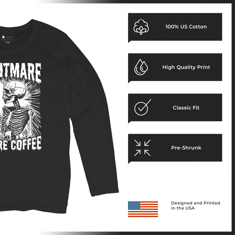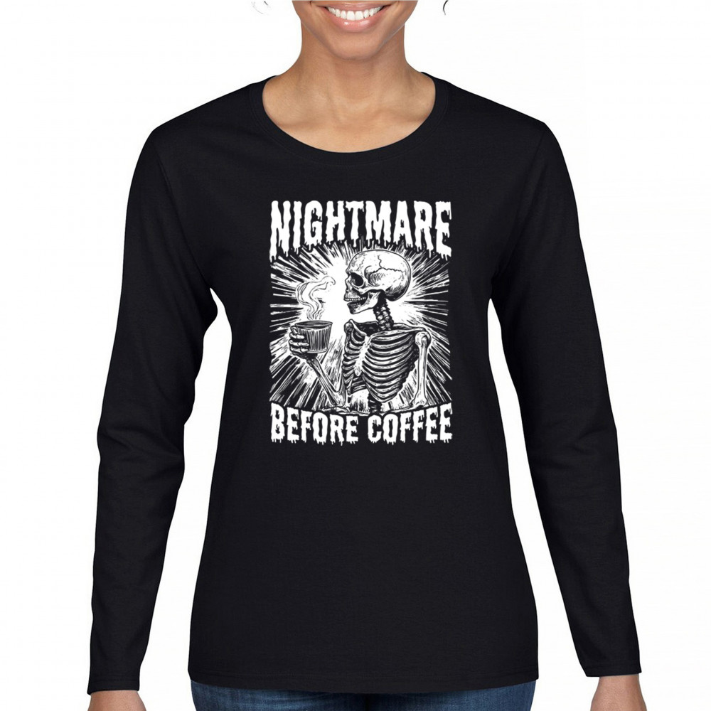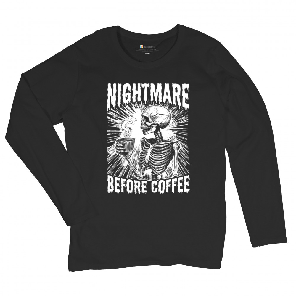 Show off your love for coffee with this quirky "Nightmare Before Coffee" skeleton design, blending humor and gothic style for caffeine lovers.