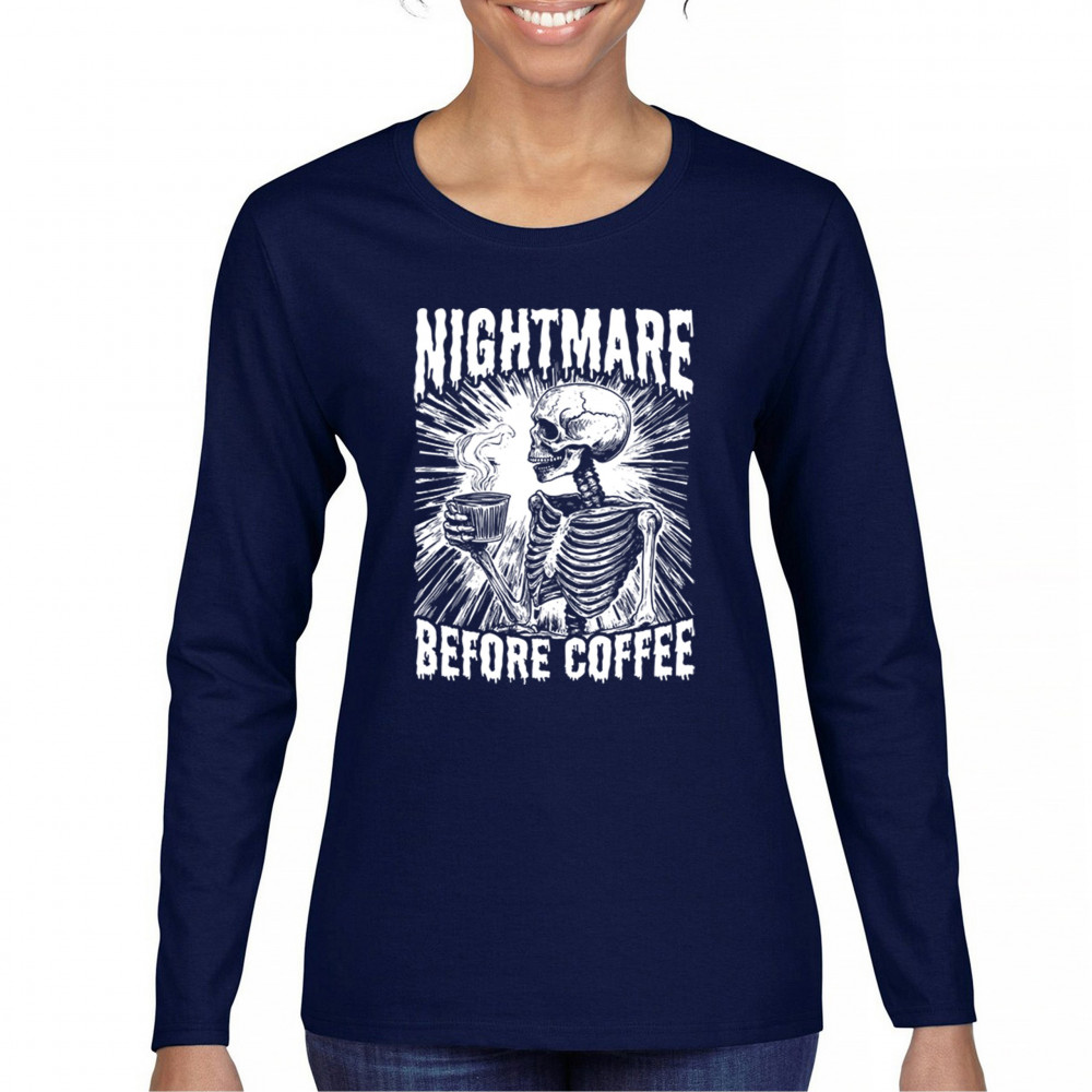 Show off your love for coffee with this quirky "Nightmare Before Coffee" skeleton design, blending humor and gothic style for caffeine lovers.