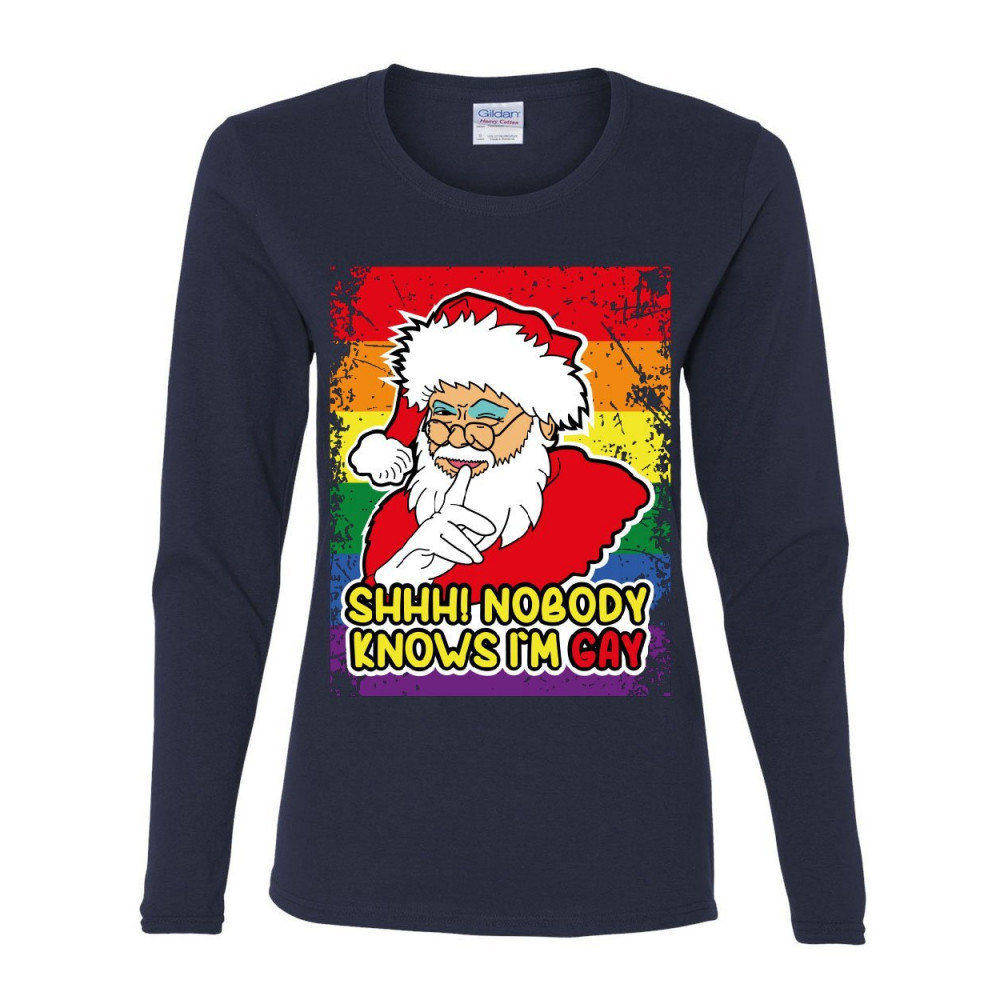 NOBODY KNOWS I'M GAY women's long sleeve tee christmas santa lgbt xmas ho ho ho navy blue