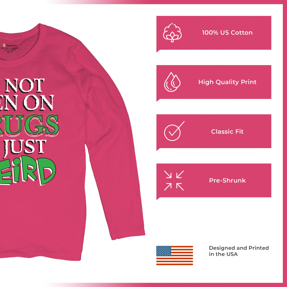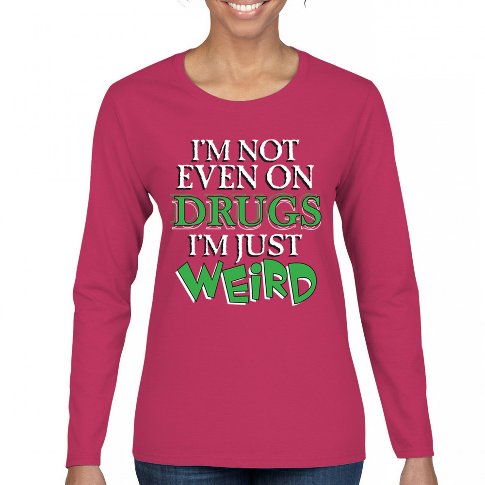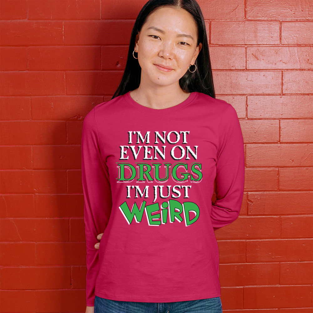 Bold weird design for introverts and quirky minds. Says “I'm not even on drugs I'm just weirdâ€â€”perfect for awkward humor and loud energy.