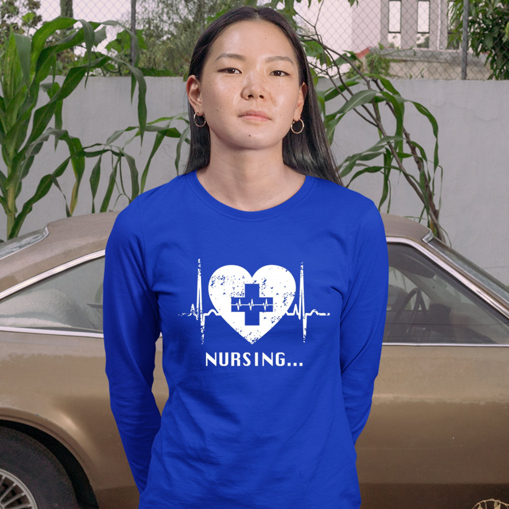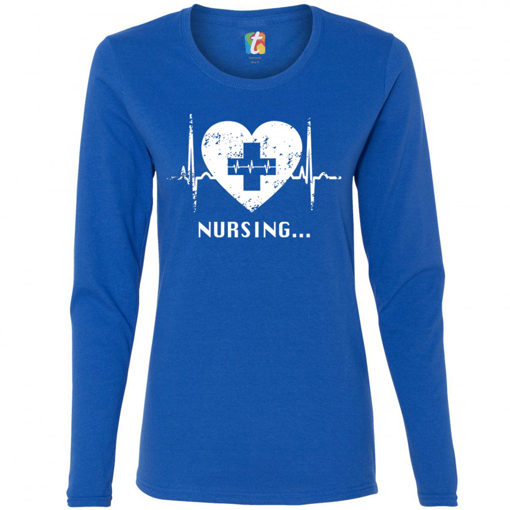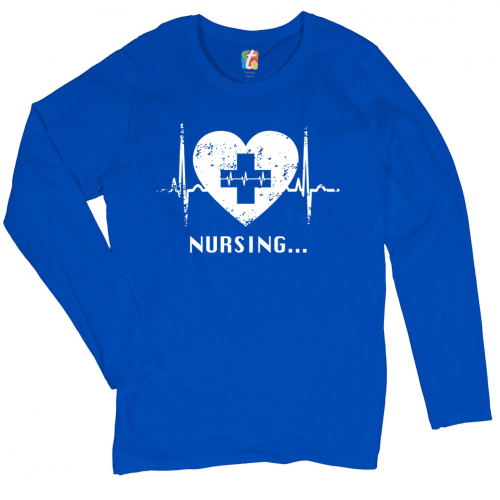 NURSING HEARTBEAT women's long sleeve t-shirt cpr first aid medical assistant royal blue