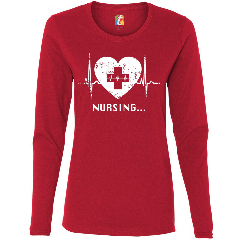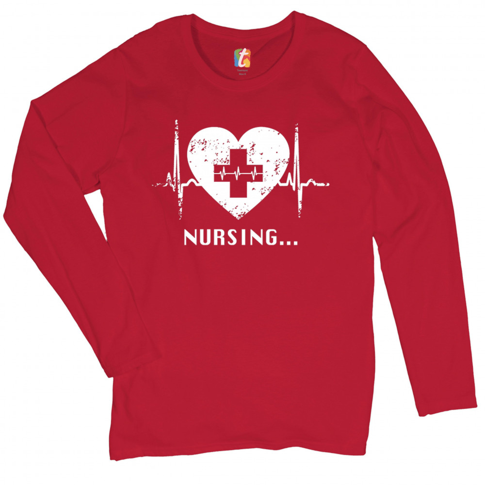 A print featuring a heart with a cross in it's center and saying "Nursing...". Inside of the cross and to the sides of the heart there is a heartbeat graph. A great choice as a gift for a registered nurse, who is busy everyday saving people's lives.