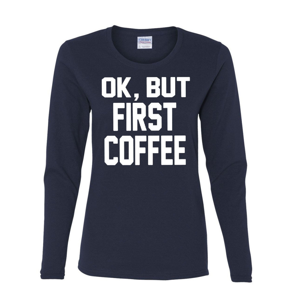OK, BUT FIRST COFFEE long sleeve t-shirt coffee drinker navy blue