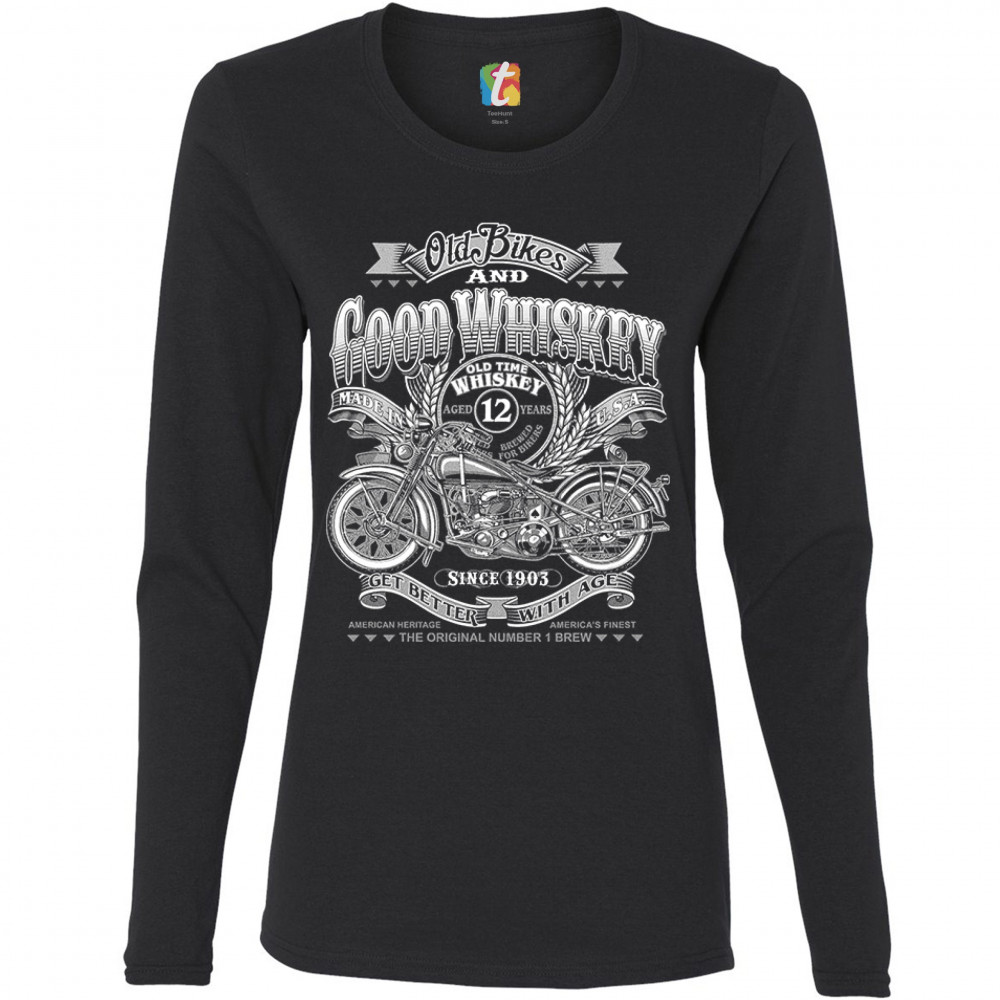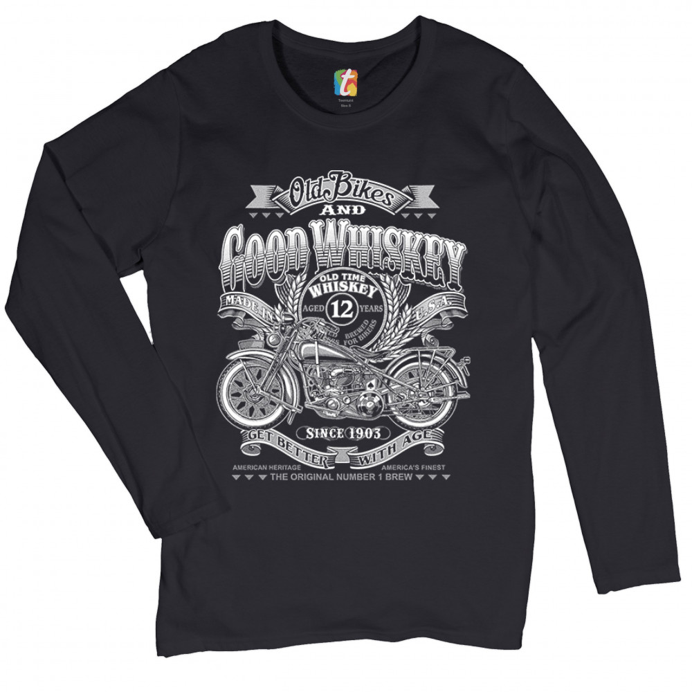 A print featuring a retro motorcycle. The print says: "Old bikes and good whiskey. Since 1903. Get better with age". In the center of the print there is a badge that says: "Old time whiskey, aged 12 years, brewed for bikers. Made in U.S.A". A great choice