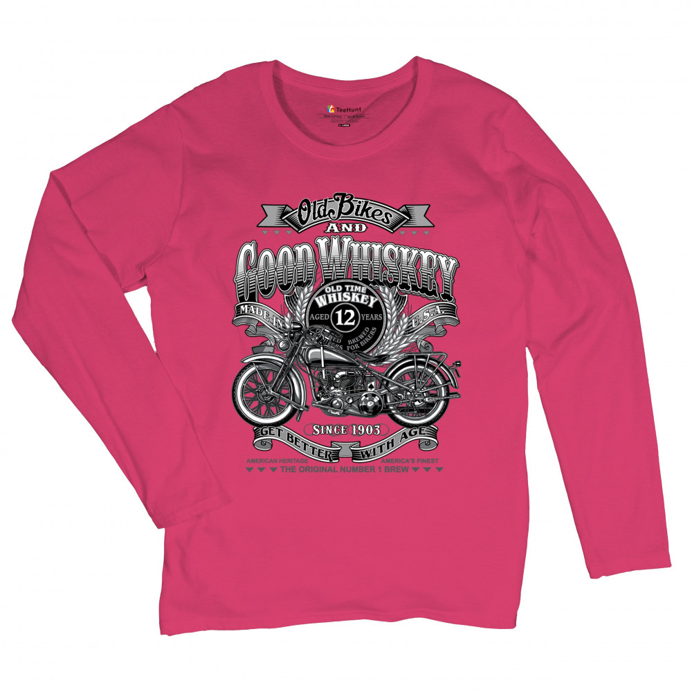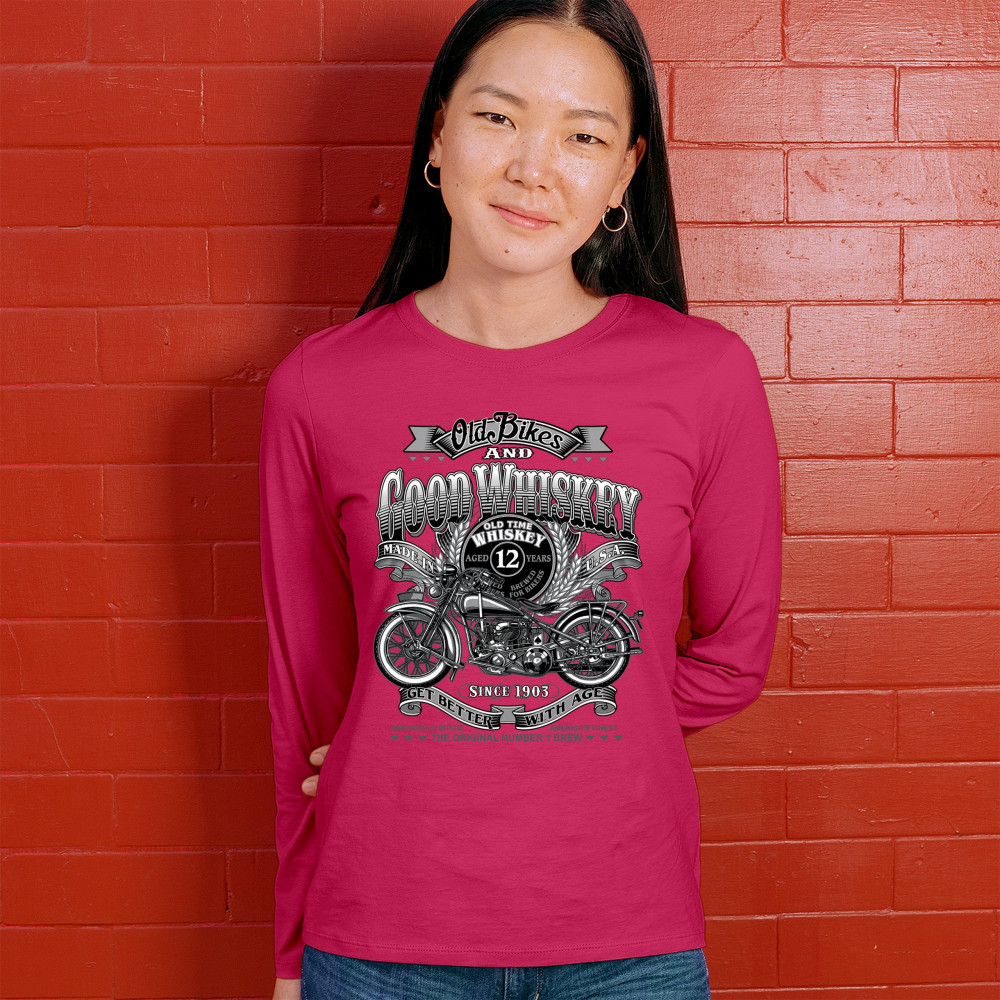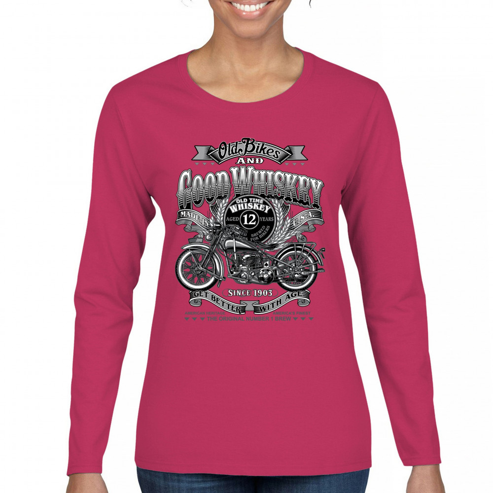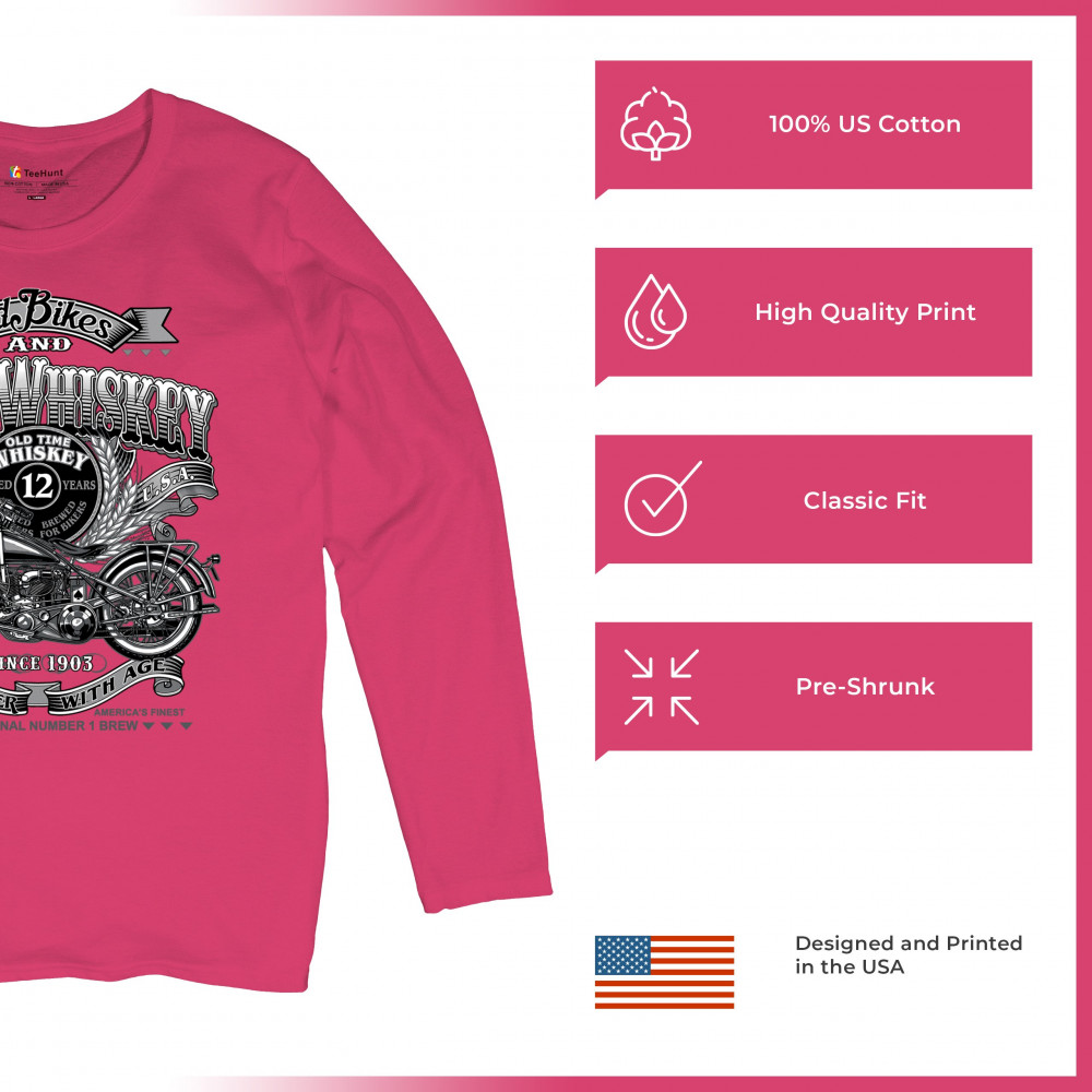 Vintage design with old bike, 12-year whiskey label, and 1903 tribute—perfect for bikers who ride hard and sip slow.
