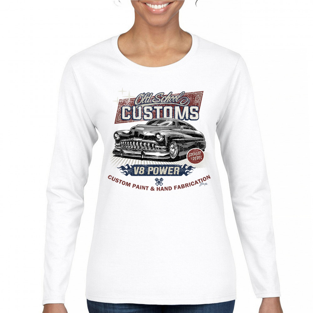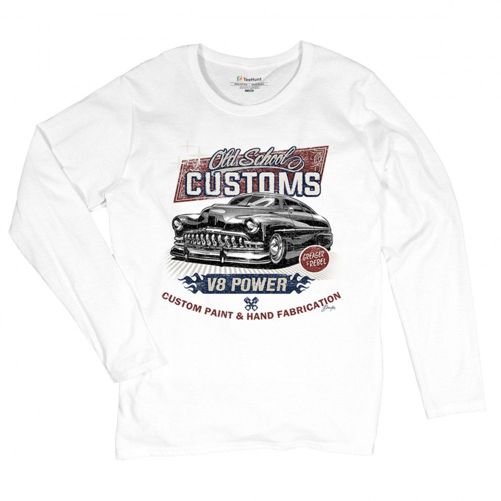 Celebrate classic automotive culture with our "Old School Customs" t-shirt, featuring a V8 power design. Perfect for car enthusiasts and fans of vintage rides.