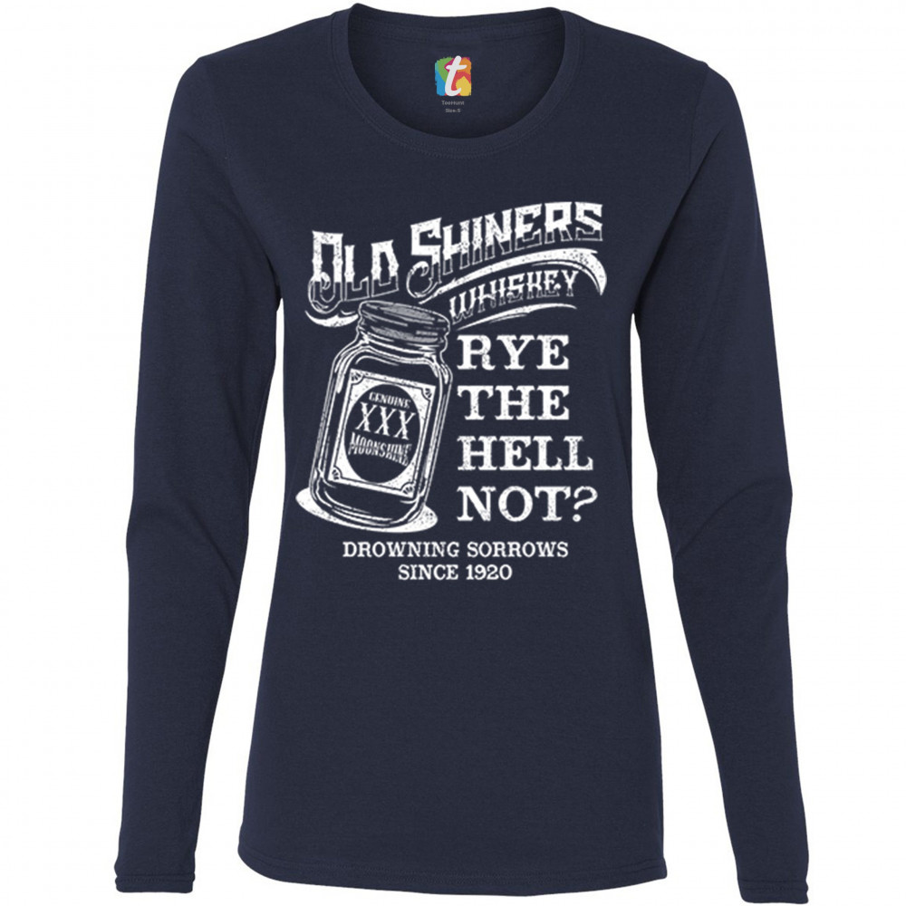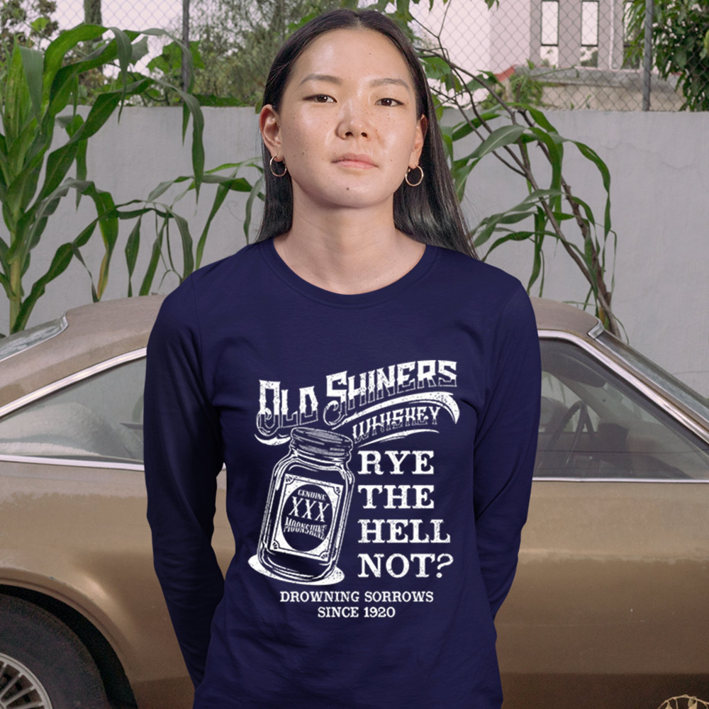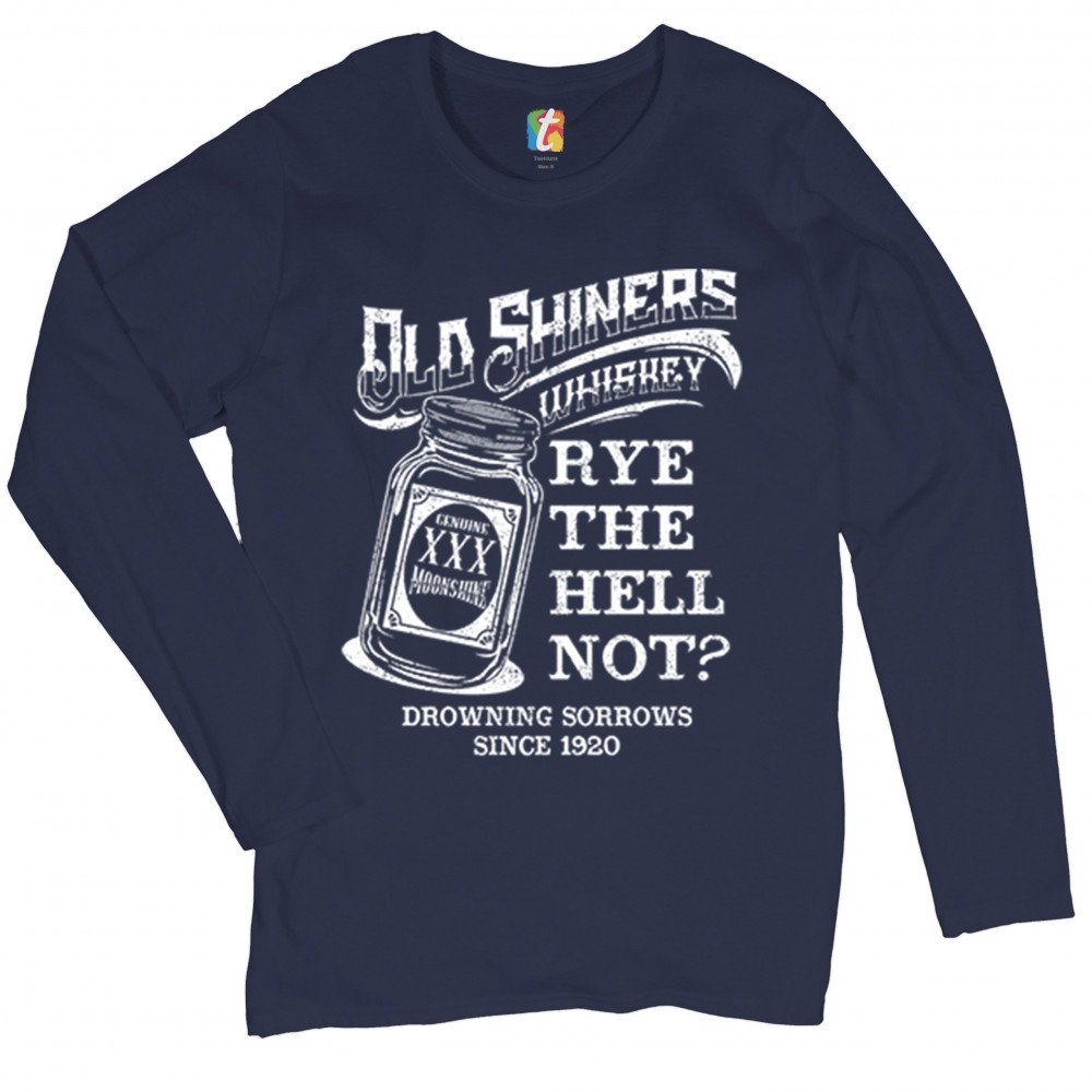 OLD SHINERS WHISKEY women's long sleeve t-shirt rye the hell not? drinking navy blue