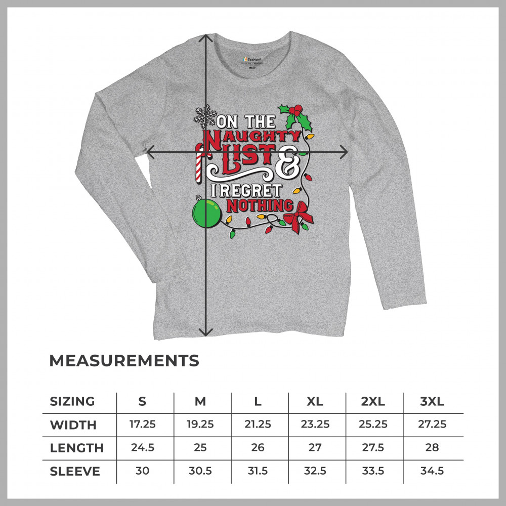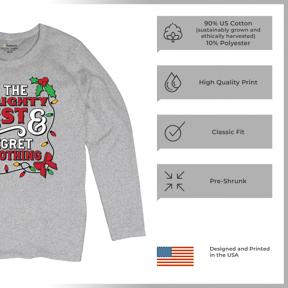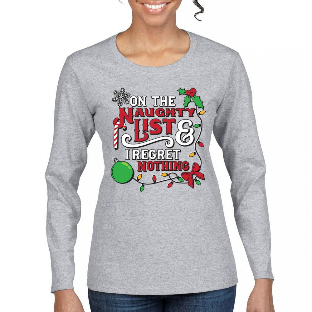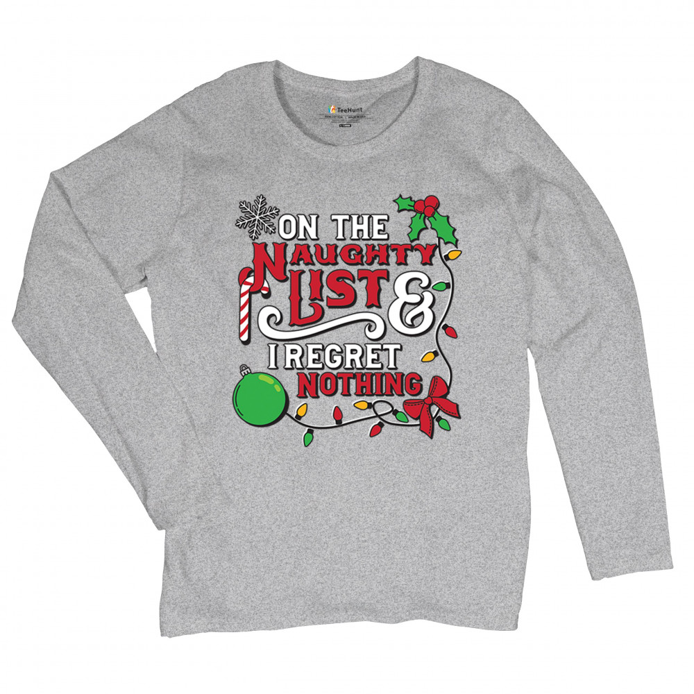 Express your holiday spirit with humor through the "Naughty List & I Regret Nothing" design, a perfect companion for Christmas celebrations, gift exchanges, or festive family gatherings. It adds a touch of playfulness to your winter wardrobe while spreading joy and laughter. Ideal for pairing with an ugly sweater or cozy holiday apparel, it’s the ultimate way to stay jolly and carefree throughout the season.