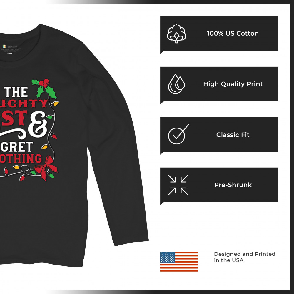 Express your holiday spirit with humor through the "Naughty List & I Regret Nothing" design, a perfect companion for Christmas celebrations, gift exchanges, or festive family gatherings. It adds a touch of playfulness to your winter wardrobe while spreading joy and laughter. Ideal for pairing with an ugly sweater or cozy holiday apparel, it’s the ultimate way to stay jolly and carefree throughout the season.