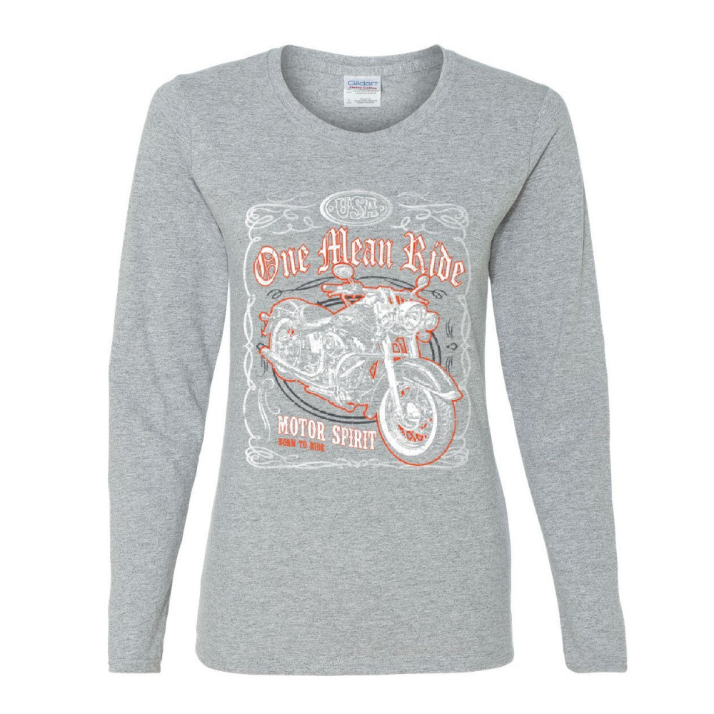 ONE MEAN RIDE women's long sleeve tee born to ride chopper bobber route 66 biker gray