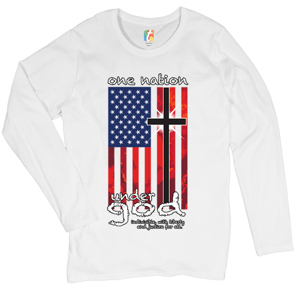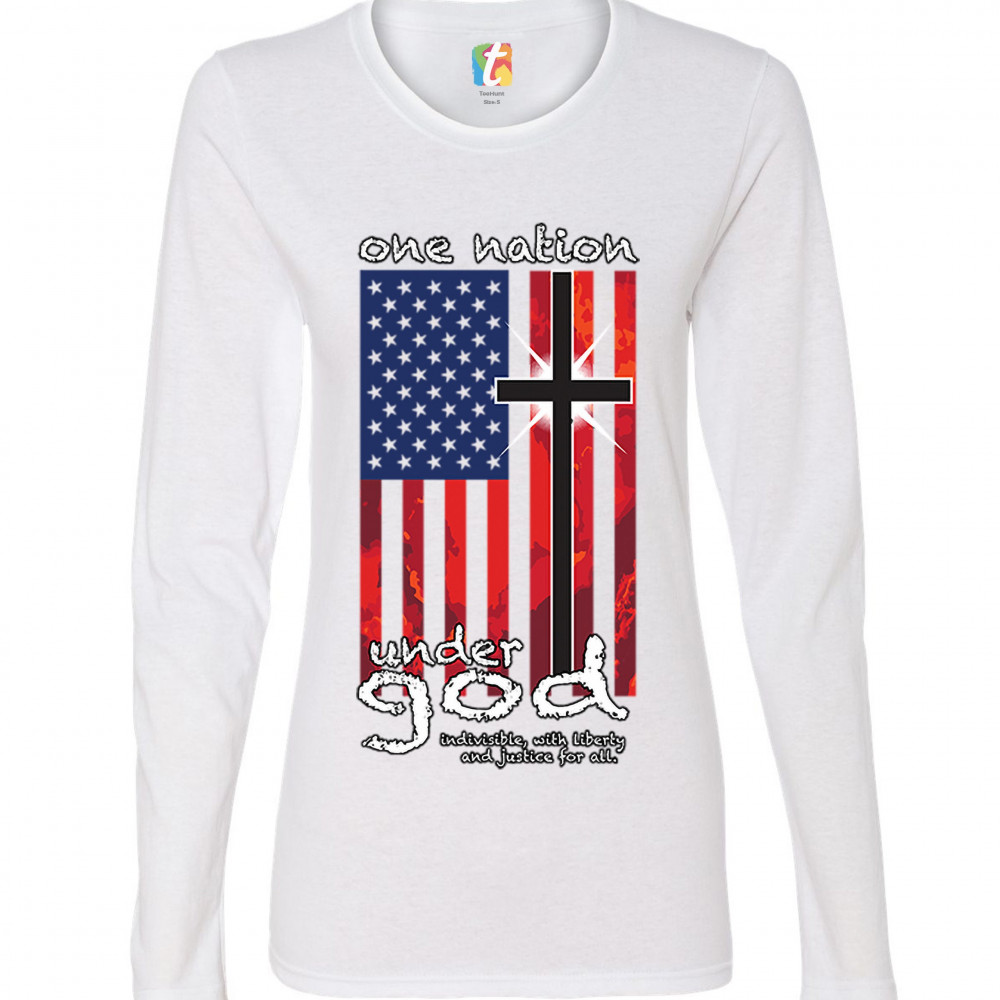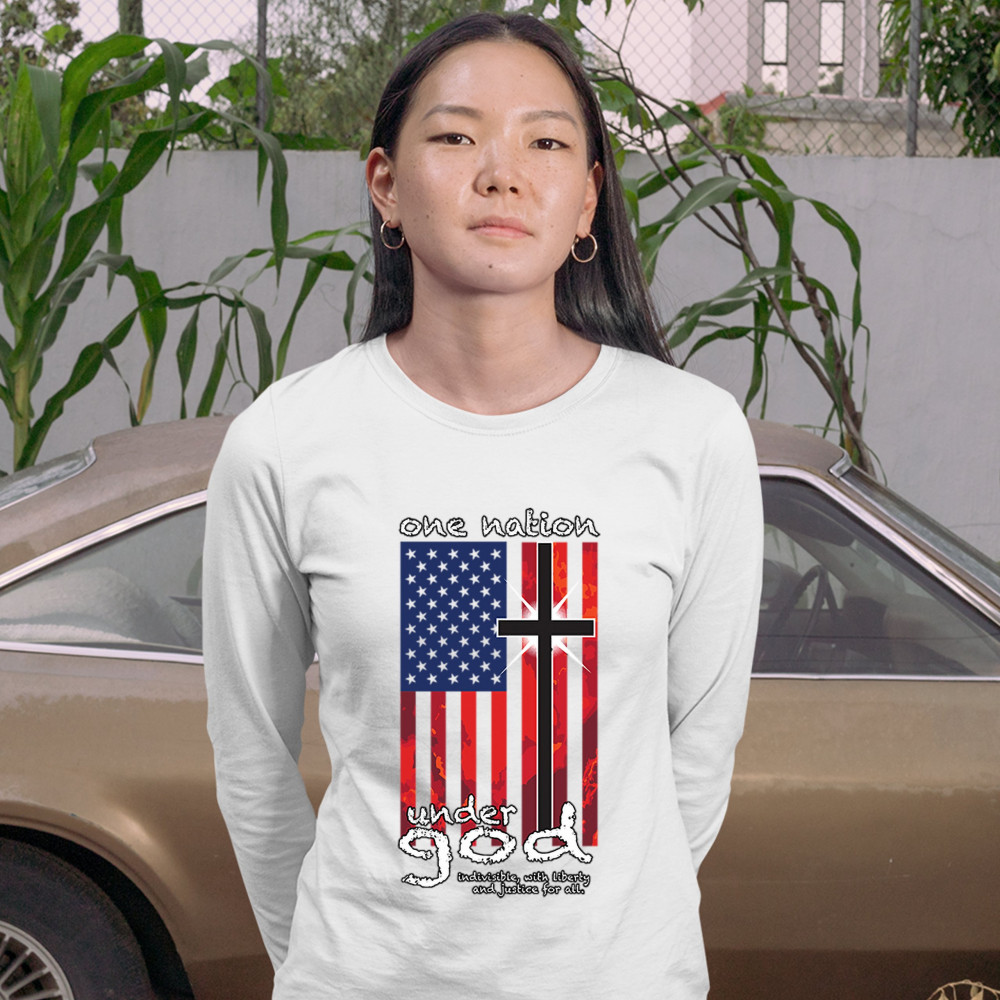 A patriotic print saying "One Nation Under God Indivisible, with Liberty and Justice for All" and featuring an American Flag with a cross instead of one of the stripes. Great choice for a religious person to wear on Independence Day or any other patriotic