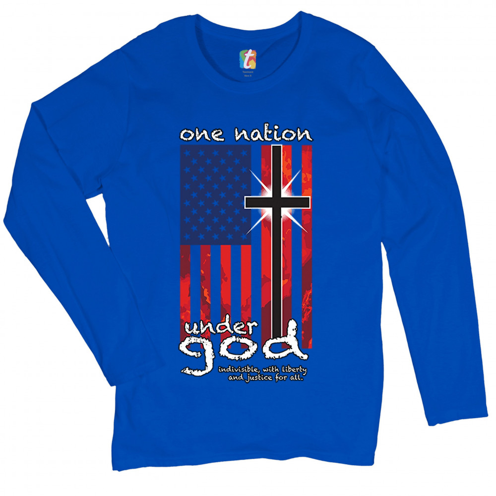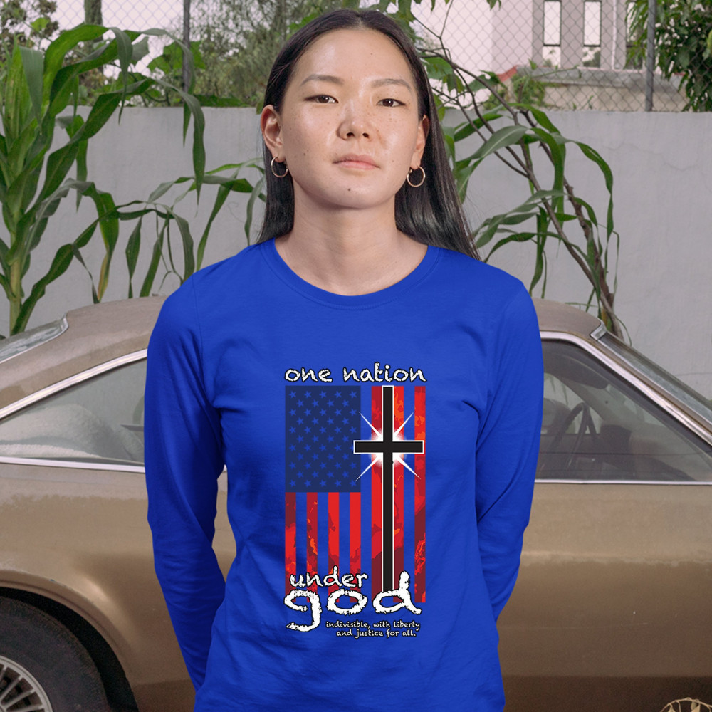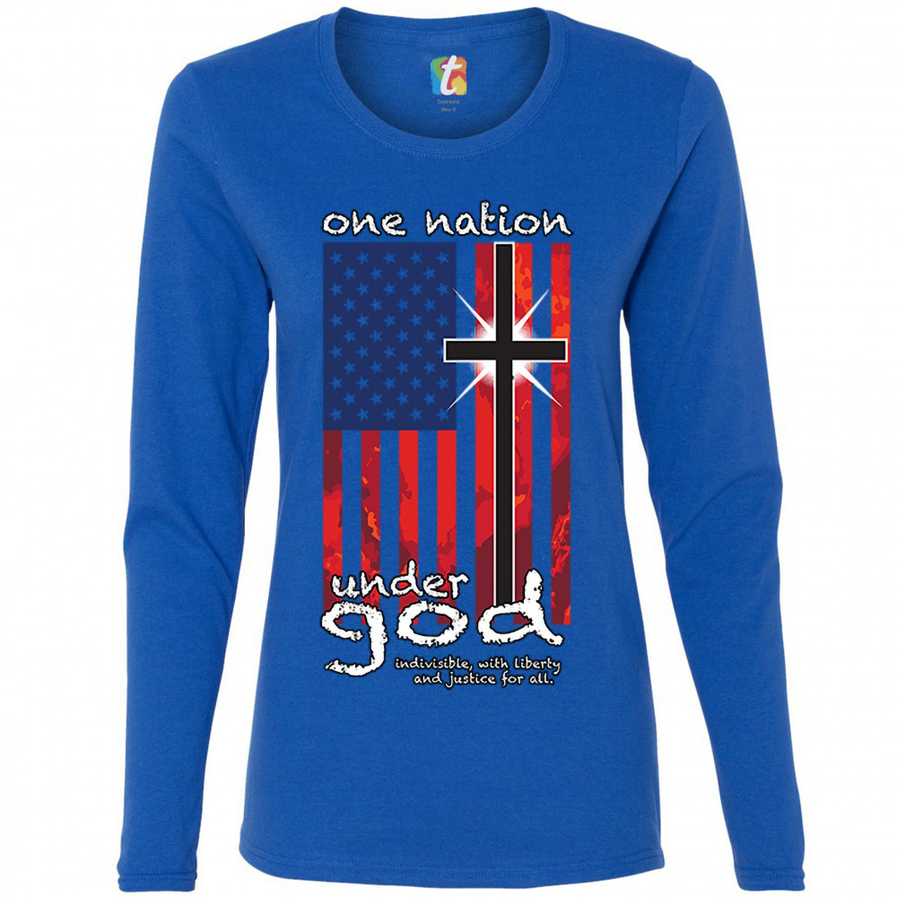 ONE NATION UNDER GOD women's long sleeve t-shirt usa american flag christian royal blue