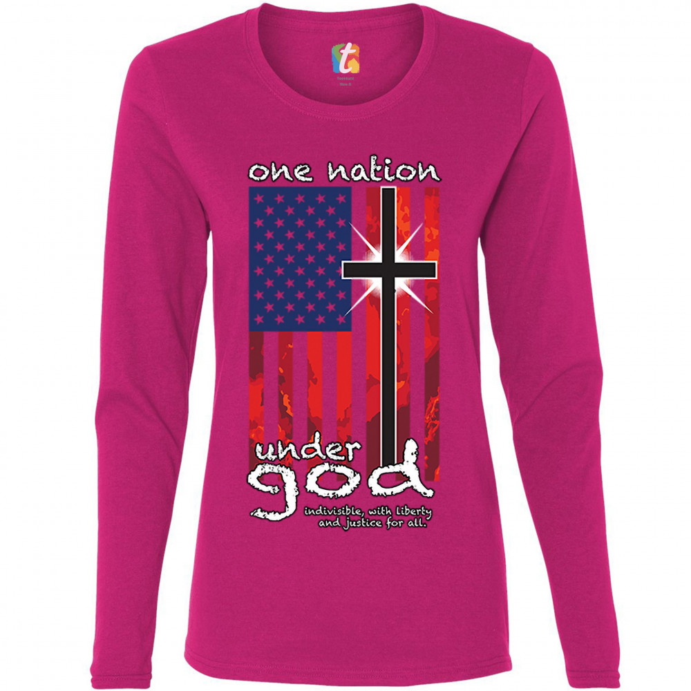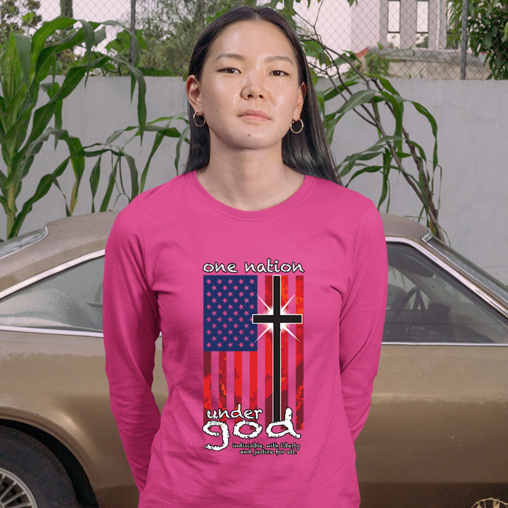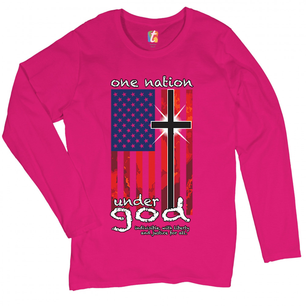 A patriotic print saying "One Nation Under God Indivisible, with Liberty and Justice for All" and featuring an American Flag with a cross instead of one of the stripes. Great choice for a religious person to wear on Independence Day or any other patriotic