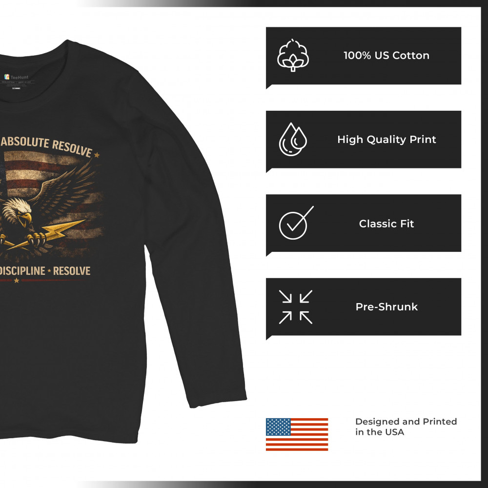A striking patriotic graphic centered on a bold bald eagle holding lightning bolts over a vintage American flag. The design reflects strength, discipline, and resolve through symbolic imagery meant to stand the test of time. Ideal for national holidays, heritage events, veterans, and anyone drawn to enduring American values.